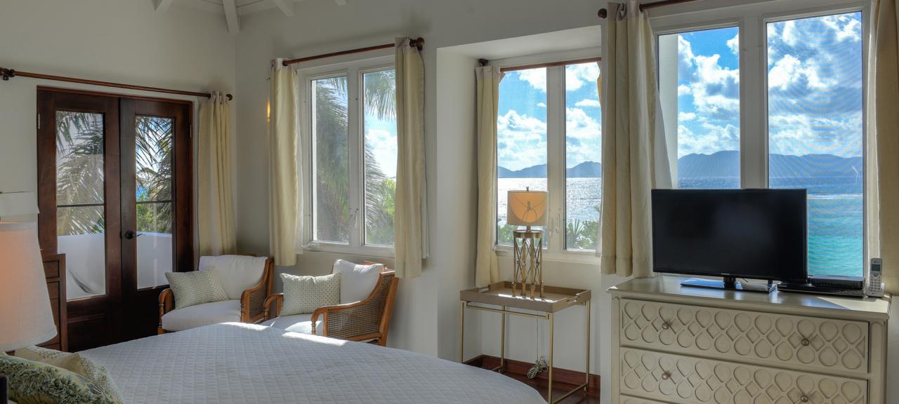 Bedroom 2: This room is located in the Main House on the upper level. This room is equipped with a king-sized bed, air conditioning, a ceiling fan, a television, and an ensuite bathroom with a standalone shower. Bedroom 2 also has a view of the Caribbean Sea and a shared office connecting with Bedroom 1.