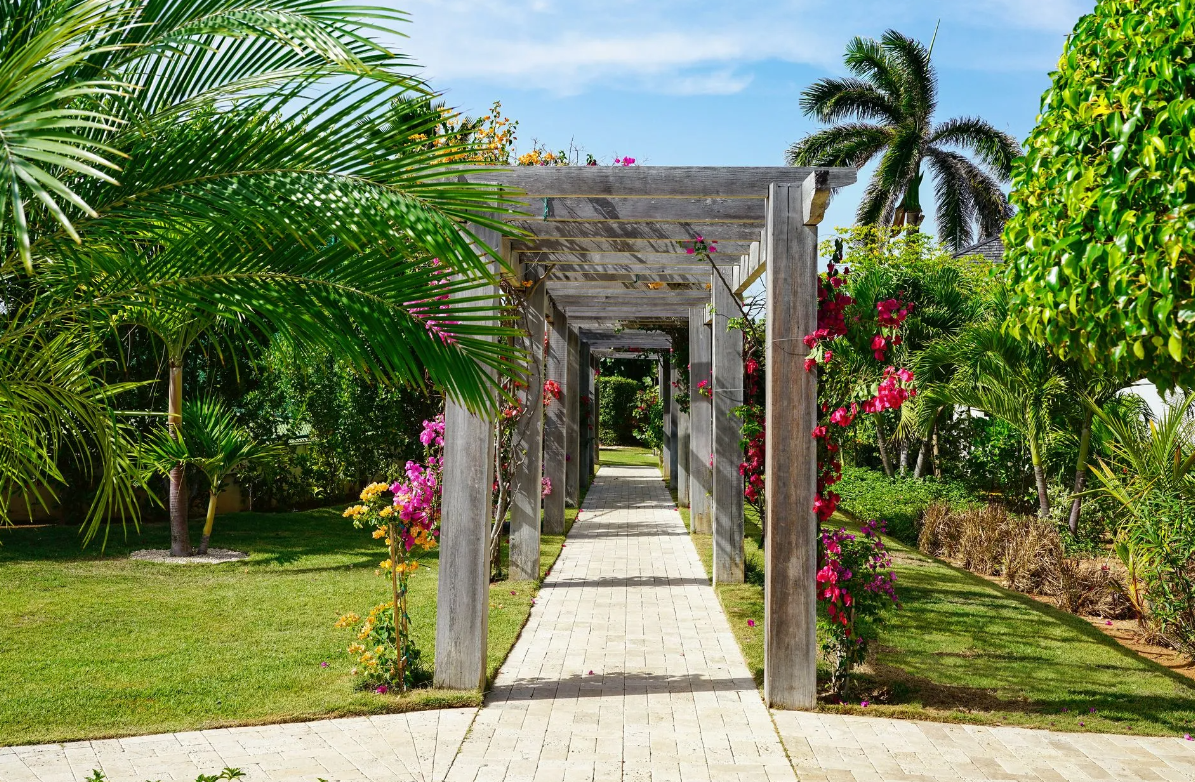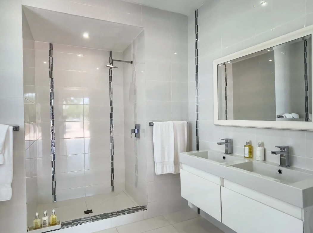 Bedroom 6: This room is located in the Main House on the lower level. This room is equipped with a king-size bed, a walk-in closet, air conditioning, a ceiling fan, a television, and an ensuite bathroom with a walk-in shower and two single vanities. Bedroom 6 opens to a private furnished terrace with a garden view.