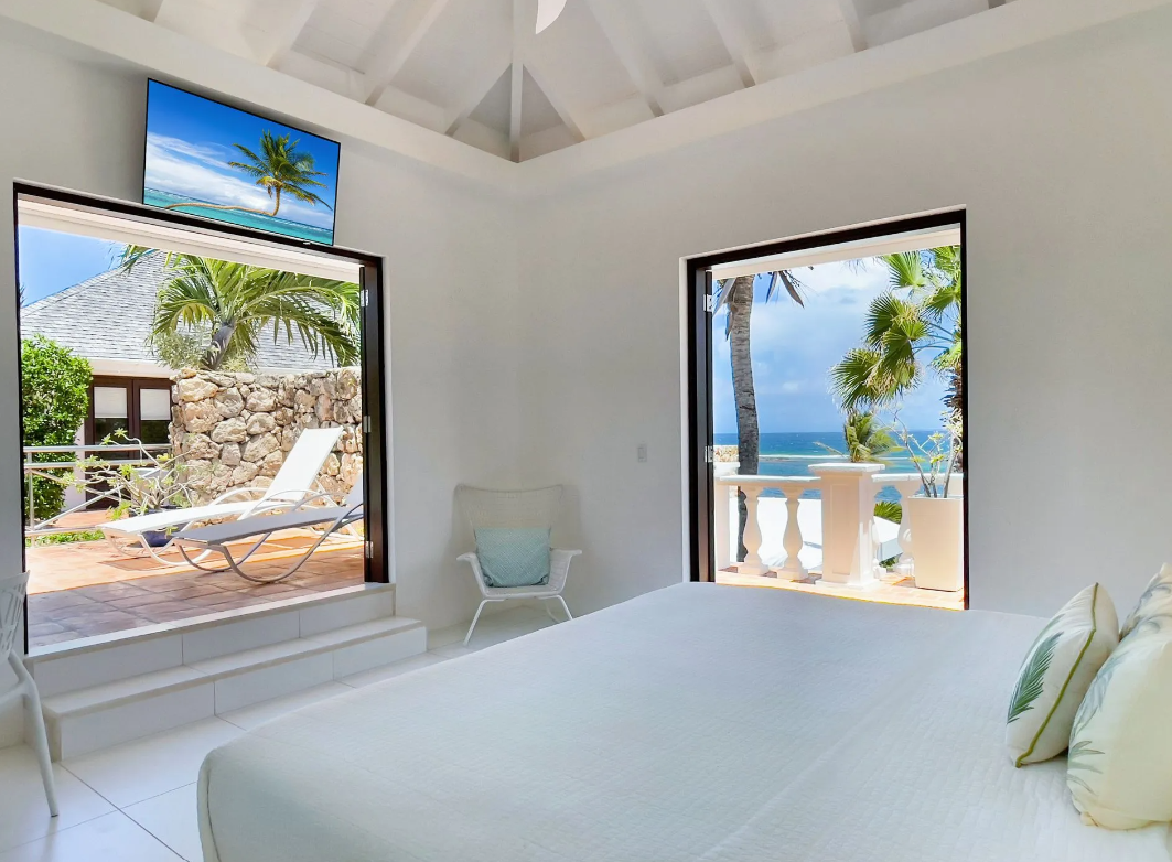 Bedroom 1: This room is located in the Main House on the upper level. This room is equipped with a king-sized bed, air conditioning, a ceiling fan, a television, and an ensuite bathroom with an indoor and outdoor shower garden and double vanities. Bedroom 1 opens onto a private furnished porch area with views of Anguila Channel and distant St. Martin.