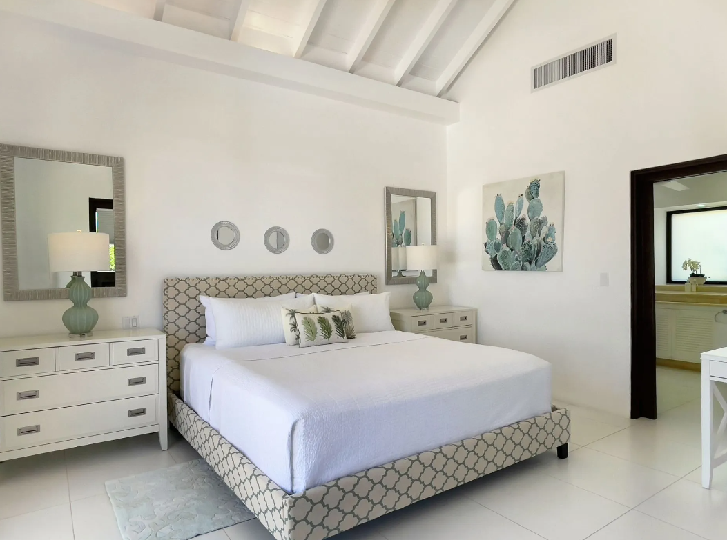 Bedroom 2: This room is located in the Main House on the upper level. This room is equipped with a king-sized bed, air conditioning, a ceiling fan, a television, and an ensuite bathroom with a walk-in shower and double vanities. Bedroom 2 opens onto the pool terrace.