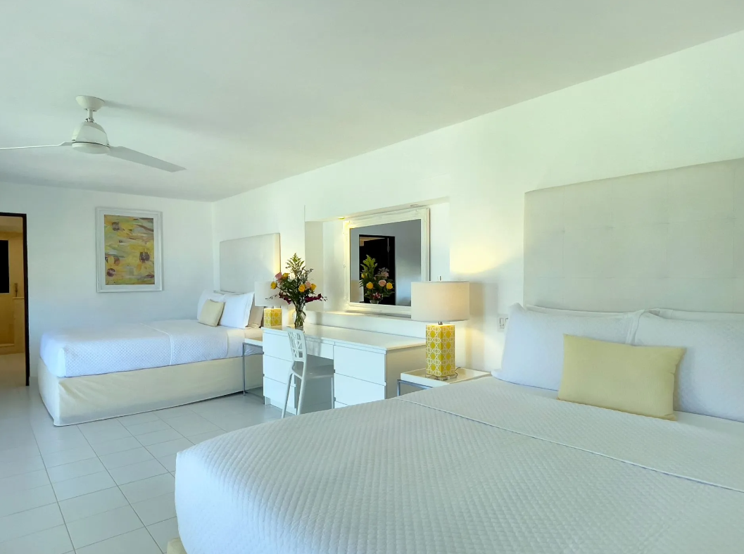 Bedroom 7: This room is located in the Main House on the lower level. This room is equipped with two queen-sized beds (upon request, they can be combined to form a super king-sized bed), air conditioning, a ceiling fan, a television, and an ensuite bathroom with a walk-in shower and double vanities. Bedroom 7 opens onto a furnished terrace with views of the Anguilla Channel and distant St. Martin.