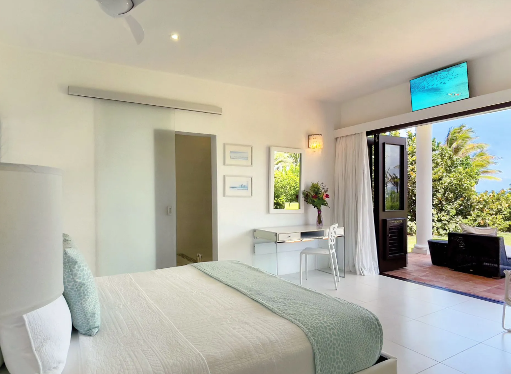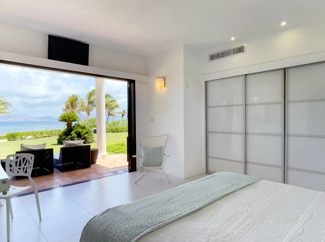 Bedroom 4: This room is located in the Main House on the upper level. This room is equipped with a king-sized bed, a walk-in closet, air conditioning, a ceiling fan, a television, and an ensuite bathroom with a walk-in shower and two single vanities. Bedroom 4 opens onto a shared furnished terrace that overlooks the Anguilla Channel and the distant St. Martin.