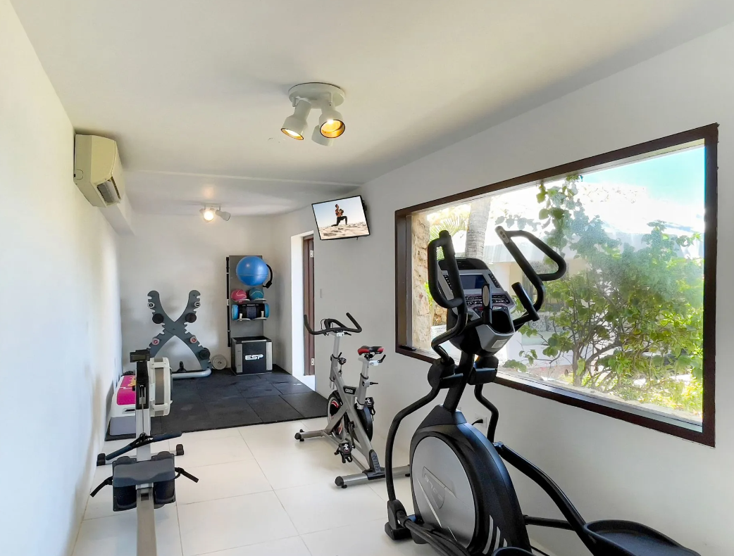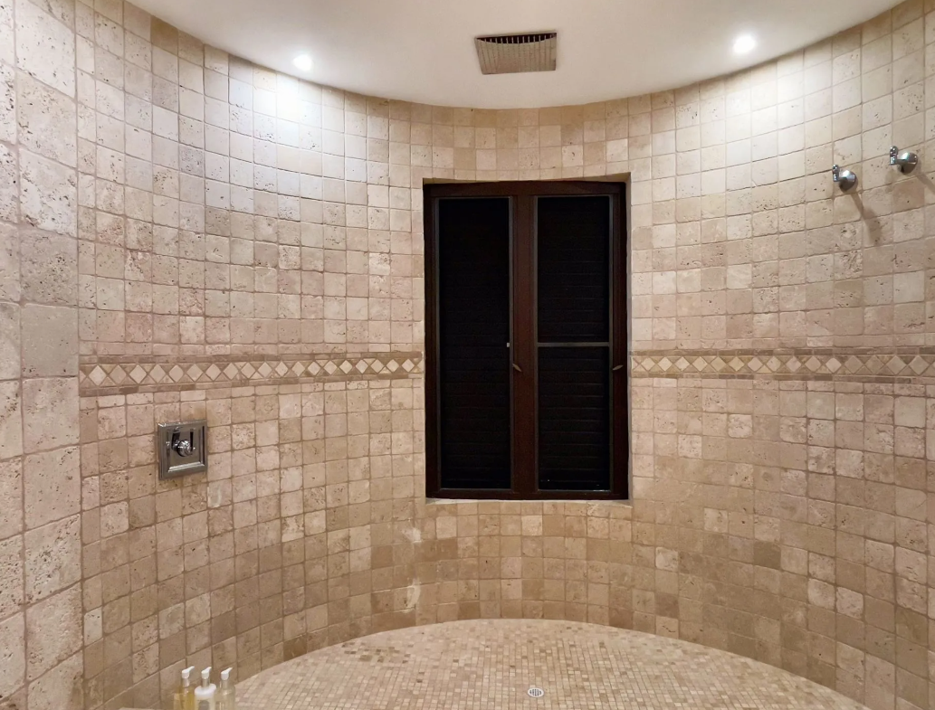 Bedroom 3: This room is located in the Main House on the upper level. This room is equipped with a king-sized bed, a walk-in closet, air conditioning, a ceiling fan, a television, and an ensuite bathroom with a walk-in shower and double vanities. Bedroom 3 opens onto the pool terrace.