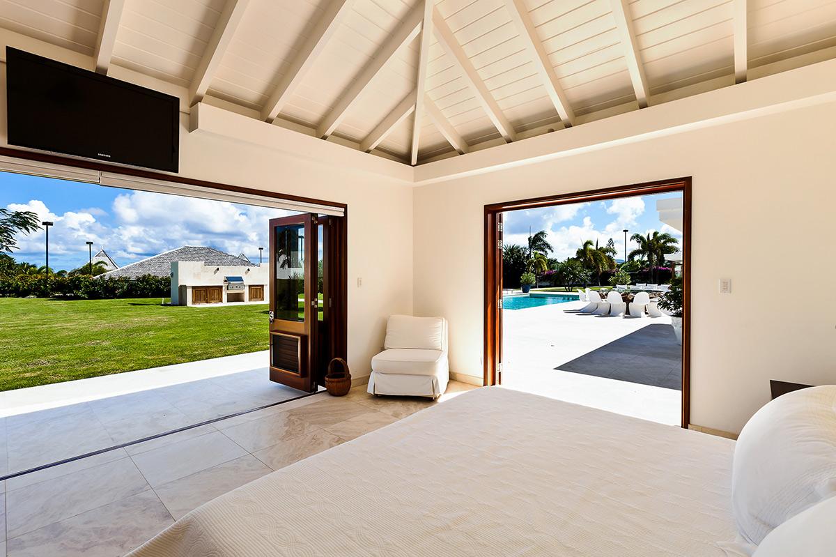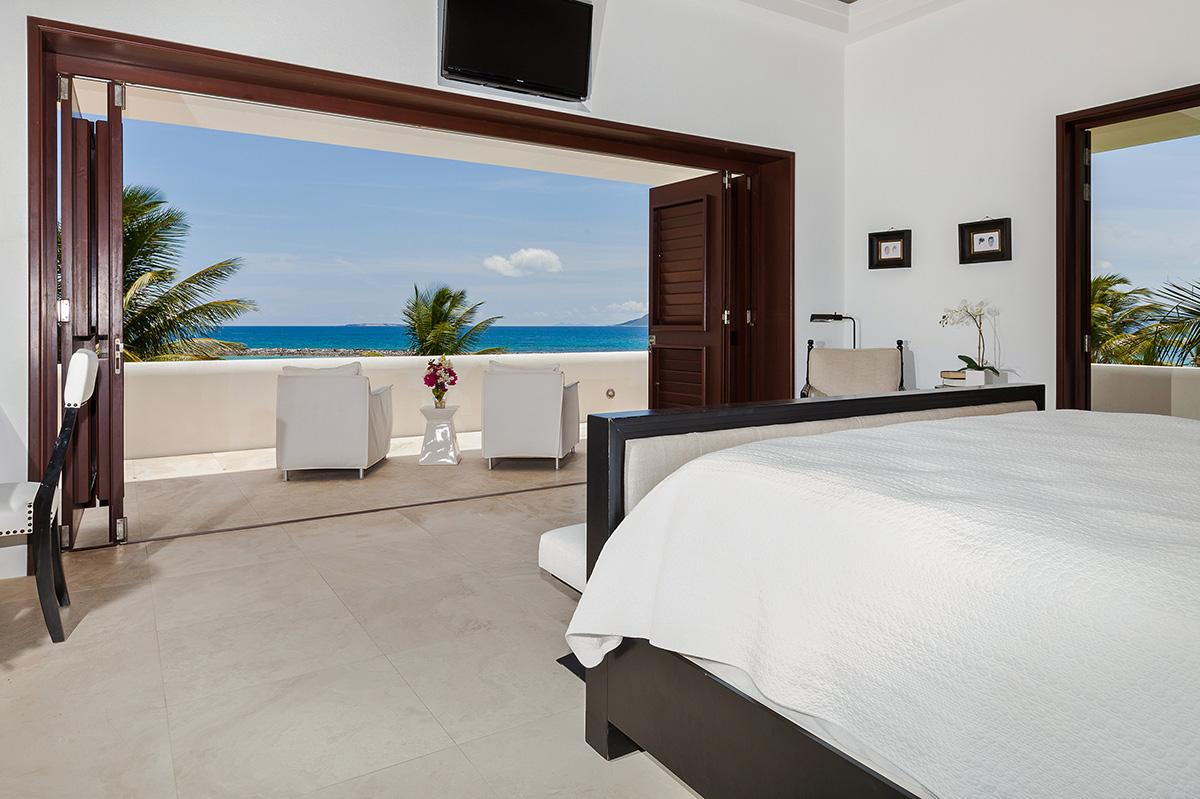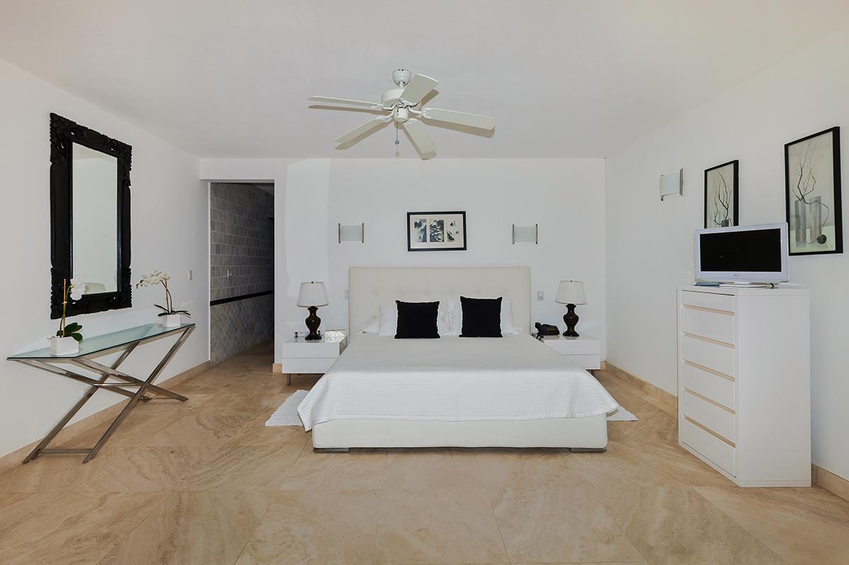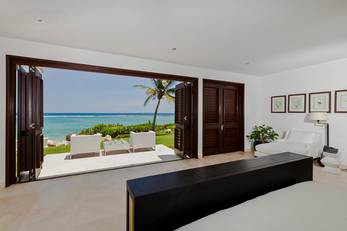 Bedroom 7: This room is located in the main house on the lower level. This room is equipped with a king-sized bed, air conditioning, a ceiling fan, a television, a chaise lounge, and an ensuite bathroom with a shower and two single vanities. Bedroom 7 also opens onto a furnished terrace with a sea view.