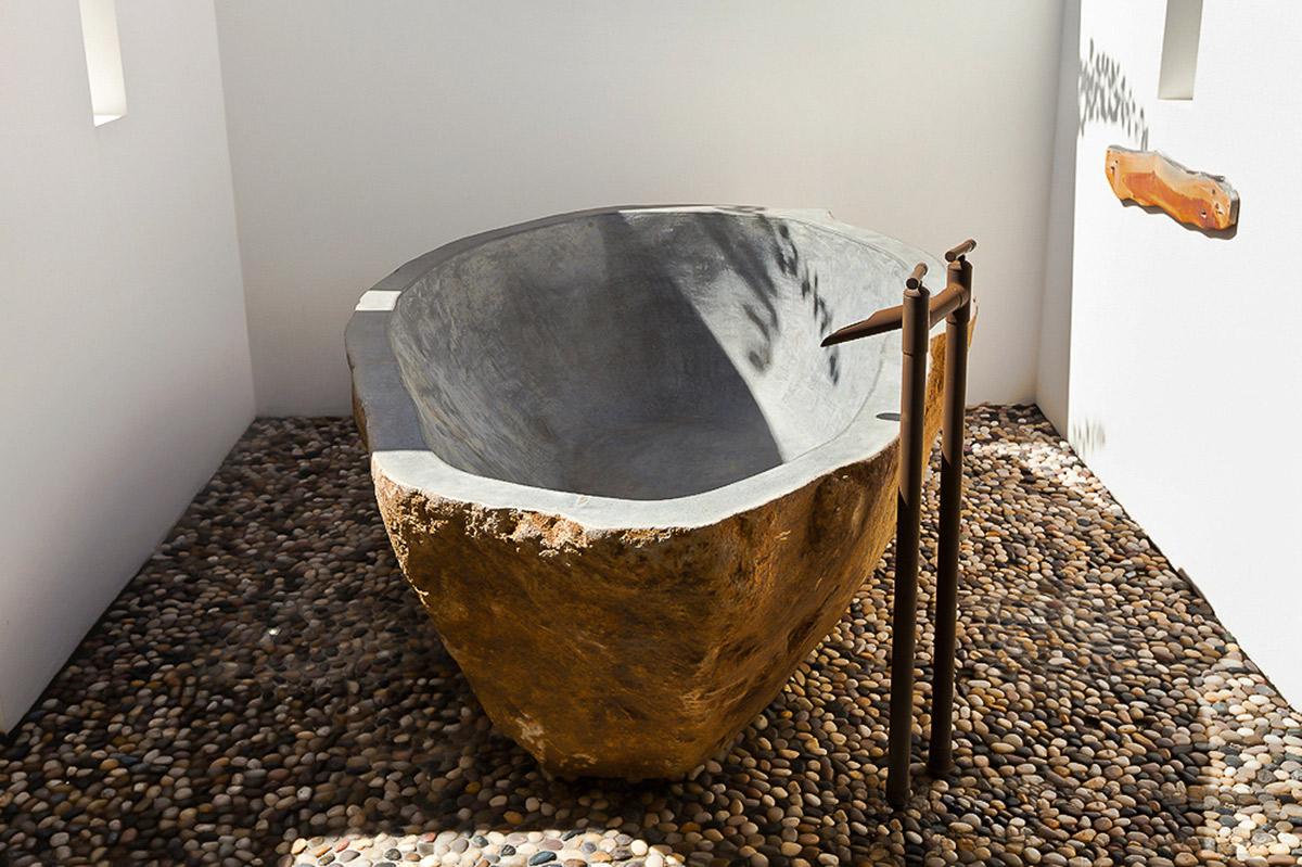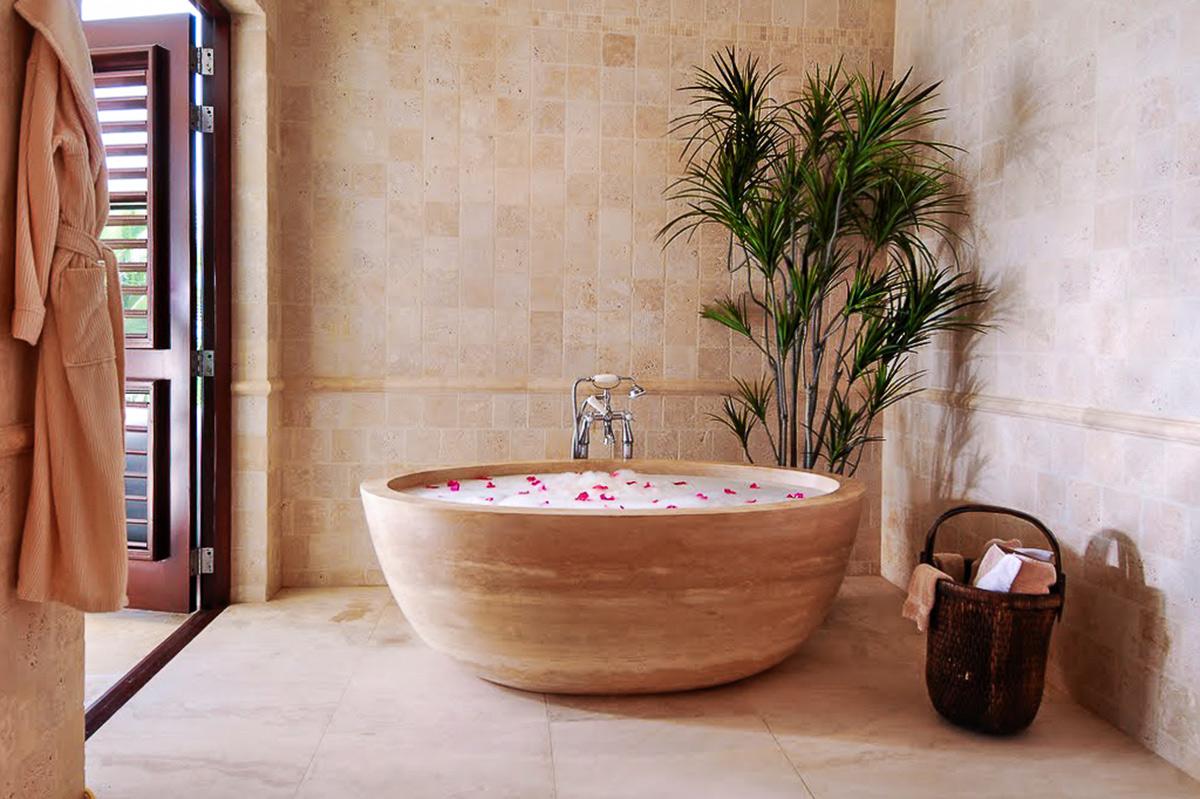 Bedroom 11: This room is located in the guest house. This room is equipped with a king-sized bed, air conditioning, a ceiling fan, and an ensuite bathroom with a walk-in shower, an outdoor freestanding bathtub, and double vanities. Bedroom 11 also opens onto a terrace with views of the garden and second swimming pool.