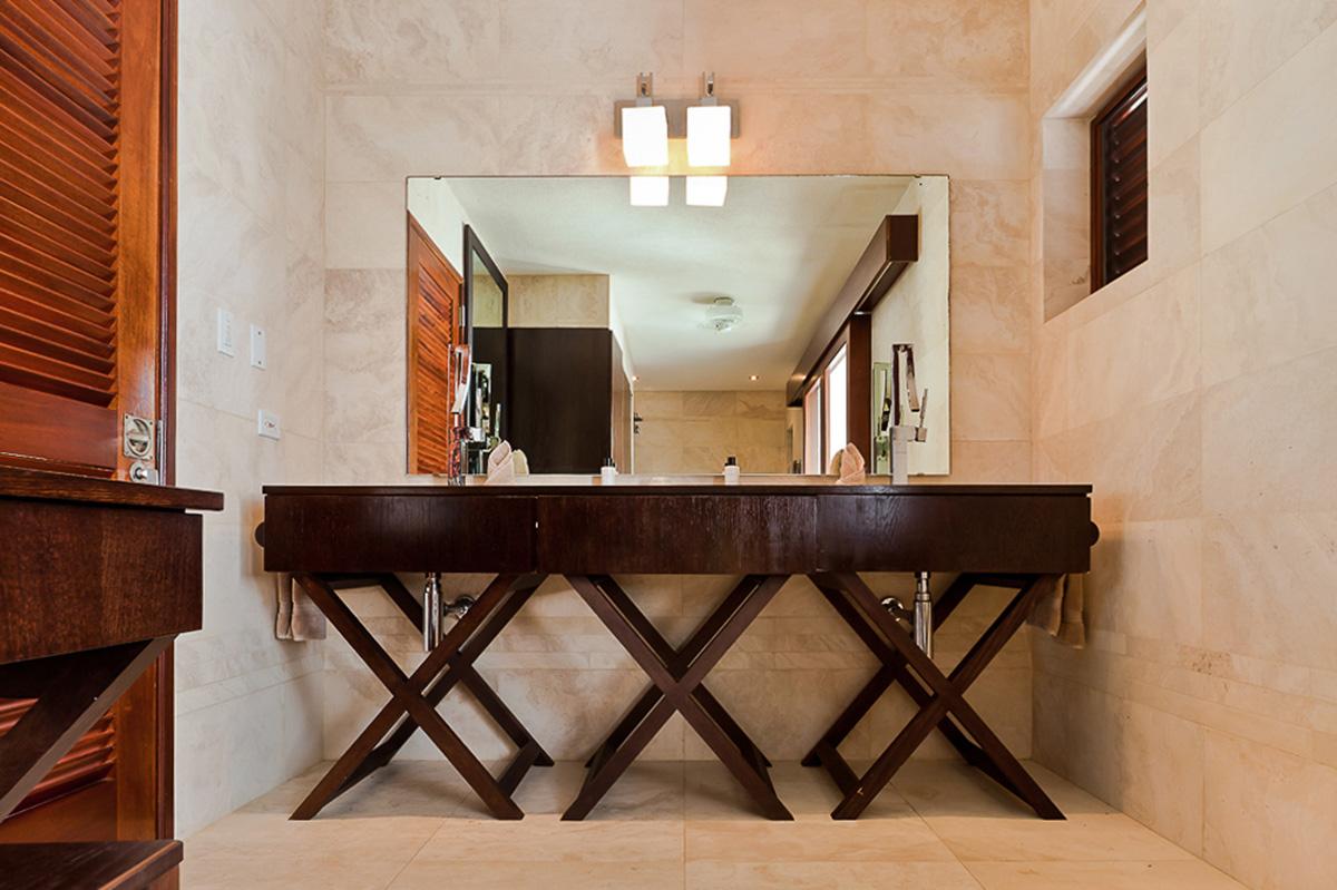Bedroom 6: This room is located in the main house on the lower level. This room is equipped with a king-sized bed (which can convert to two twin beds upon request), air conditioning, a ceiling fan, and an ensuite bathroom with a shower and double vanity. Bedroom 6 also opens onto a terrace with a sea view.