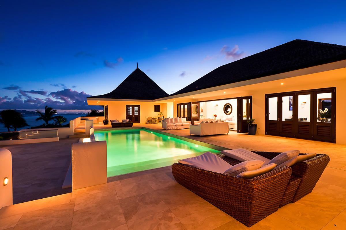 Le Bleu is simply the most exciting and glamorous villa in Anguilla. Le Bleu sits on the coast at the mouth of the bay. The main residence faces south-east with a fabulous view of Dutch and French St. Martin, and St. Barths in the distance. This ten bedroom villa, all en-suite, is located on approximately 2.5 acres of beautiful tropical gardens with two swimming pools, two small natural beaches, beach pavilion, tennis court, gym, personal cinema and beautiful water garden. Le Bleu is unique in both location and design. Spacious and modern - the experience it provides is one of fresh air, blue skies and the myriad colours of the sea. Le Bleu offers fabulous open style living in a superb private location. Relax and enjoy the fine white sand beaches, transparent water, and unspoiled beauty of Anguilla with Villa Luxe.