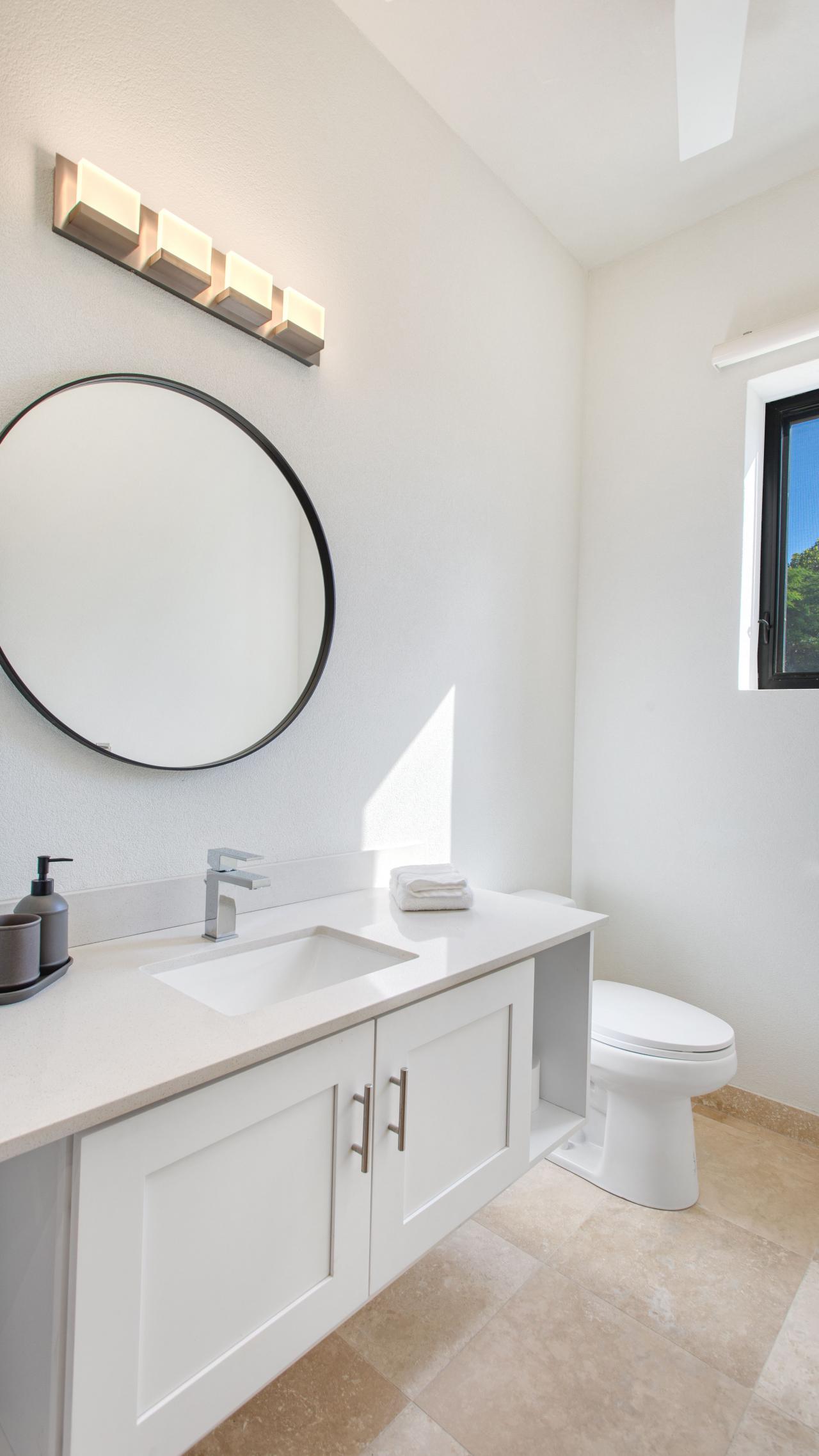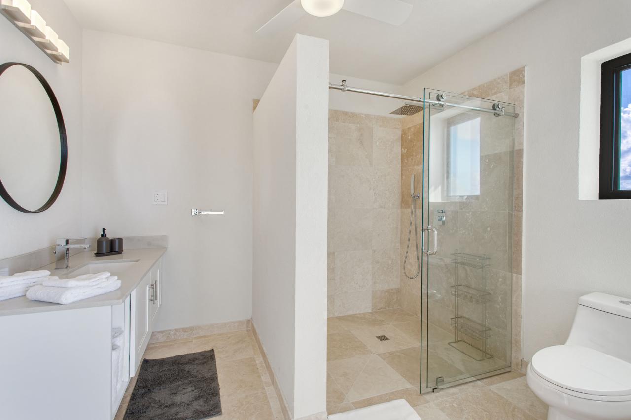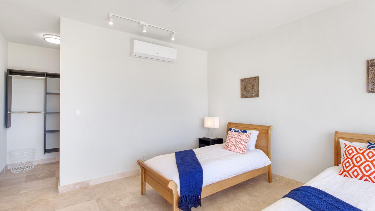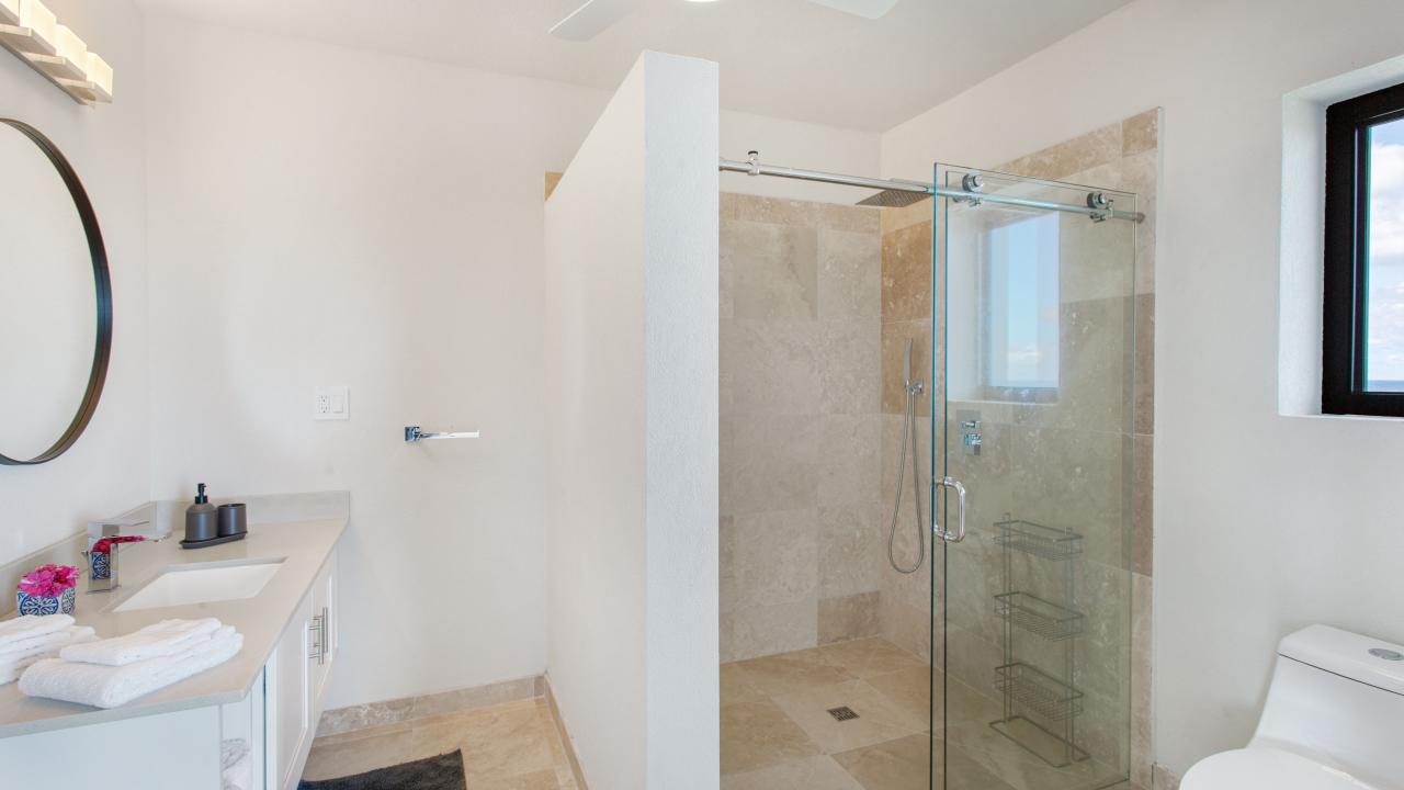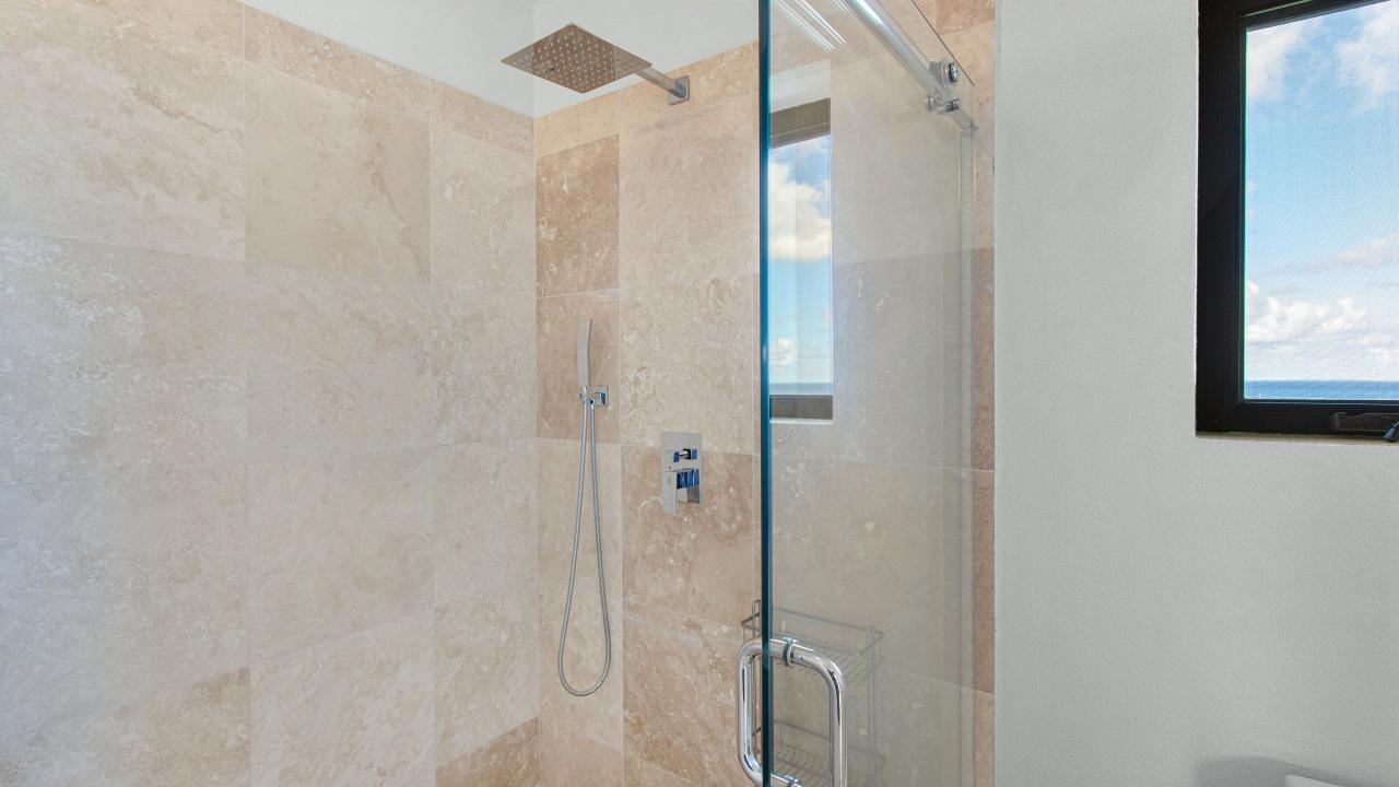 Bedroom 3: This room is equipped with two twin-sized beds (which can be converted into a king-sized bed), a walk-in closet, air conditioning, a ceiling fan, and an ensuite bathroom with a walk-in shower with a rain head. Bedroom 3 also has direct access to a balcony with an ocean view.