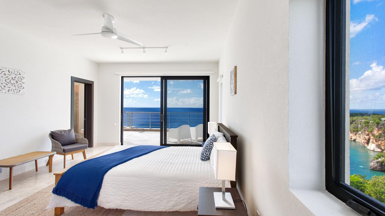 Bedroom 1: This room is equipped with a queen-sized bed, a walk-in closet, air conditioning, a ceiling fan, a seating area, and an ensuite bathroom with a walk-in shower with a rain head. Bedroom 1 also has direct access to a balcony with an ocean view.
