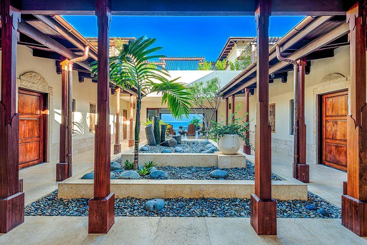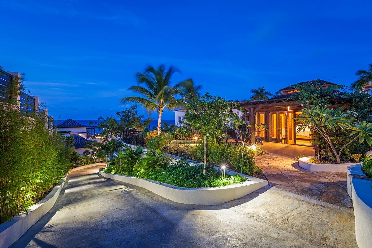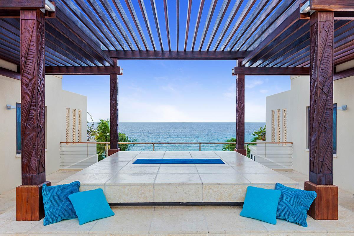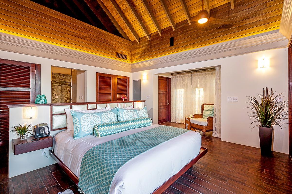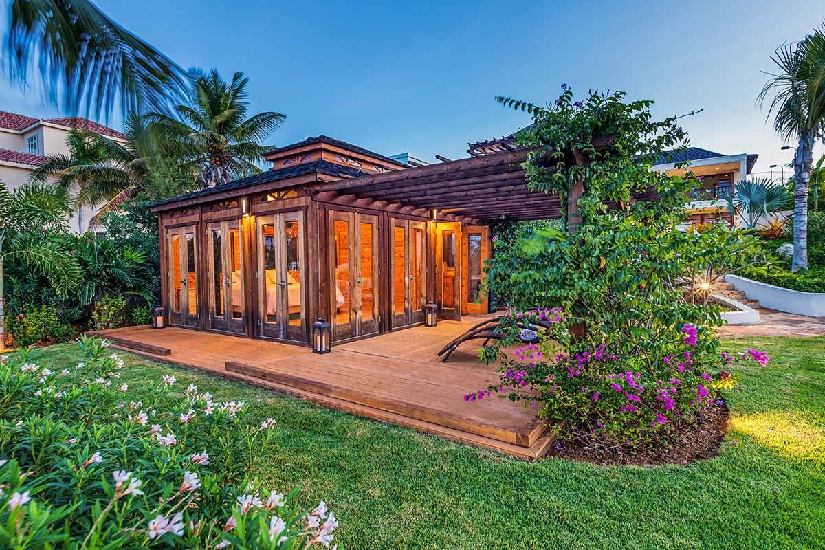 full bathroom and separate powder room shared with bedroom 7, stand-alone shower and bathtub, TV, terrace- Bedroom 9: Cabana bedroom with king bed, ensuite bathroom with stand-alone shower, TV, wrap-around terrace with garden and ocean views
