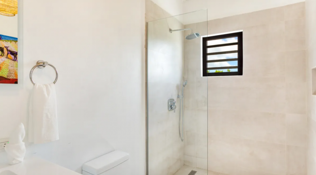 Bedroom 1: King bed with ac, ceiling fan, television, bedside charging ports, direct access to pool terrace with ocean view, and ensuite bathroom with walk-in shower and double vanity.