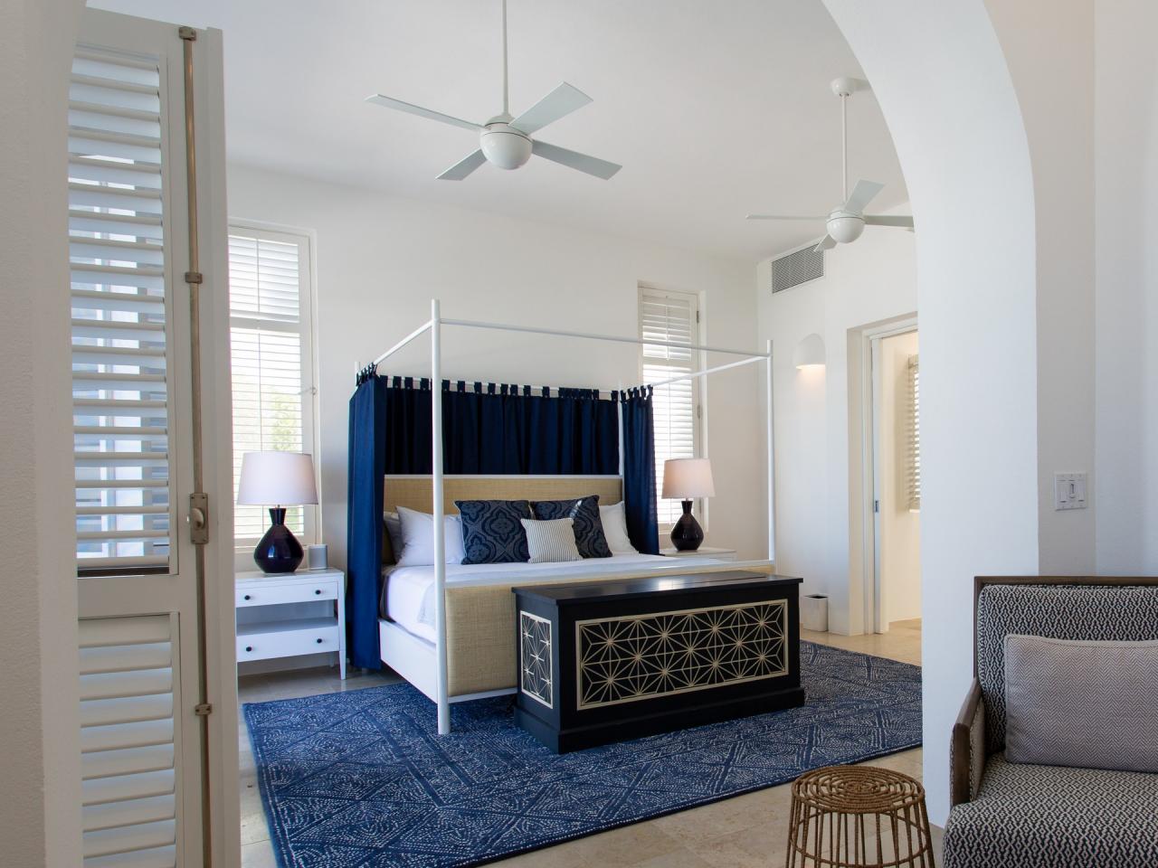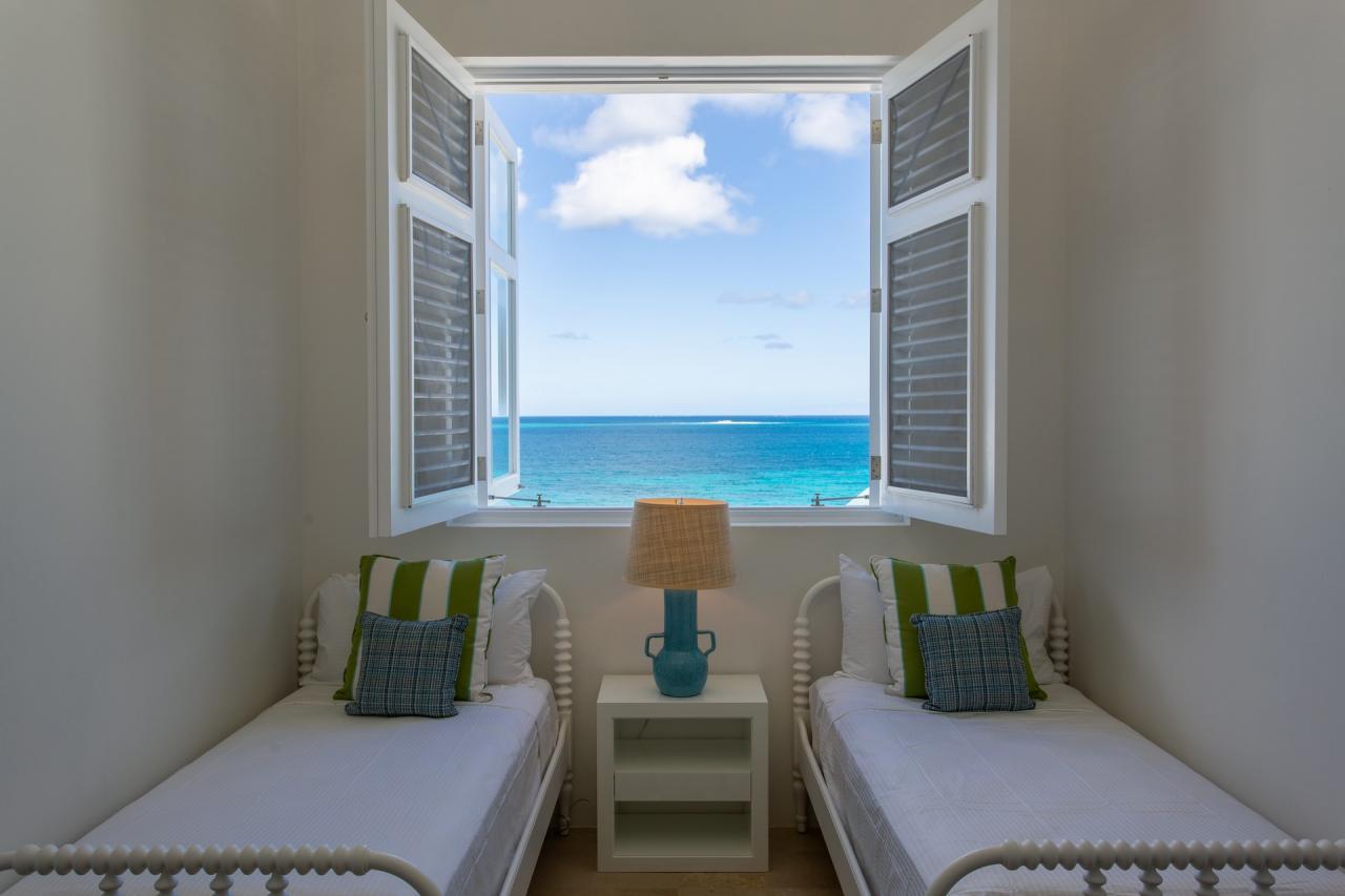 Primary Bedroom 2: This room is located on the lower level and is equipped with a king-sized bed (which can be converted to two twin beds upon request), air conditioning, a ceiling fan, a seating area, and an ensuite bathroom with indoor adn outdoor showers, a freestnading bathtub, double vanities, and a walk-in closet. This room also opens onto a furnished terrace with a sea view.