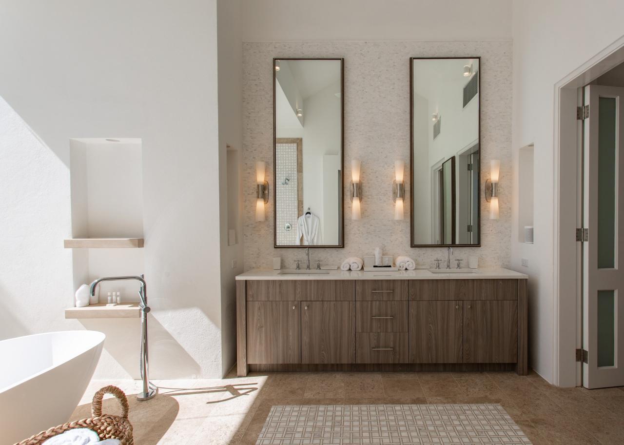 Primary Bedroom 3: This room is located on the lower level and is equipped with a king-sized bed (which can be converted into two twin-sized beds upon request), air conditioning, a ceiling fan, a seating area, and an ensuite bathroom with indoor and outdoor showers, a freestanding bathtub, double vanities, and a walk-in closet. This room also opens onto a furnished terrace with a sea view.