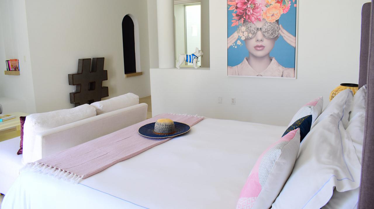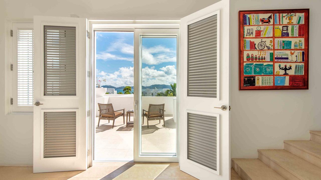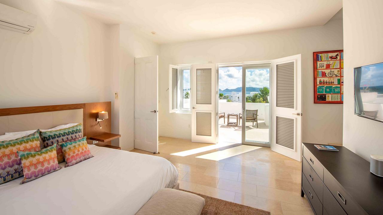 Bedroom 4 - Frangipani: This room is located on the upper level and is equipped with a queen-sized bed, air conditioning, a ceiling fan, a television, a desk, a double terrace, and an ensuite bathroom with a freestanding bathtub, indoor and outdoor walk-in rain showers, and a walk-in closet.