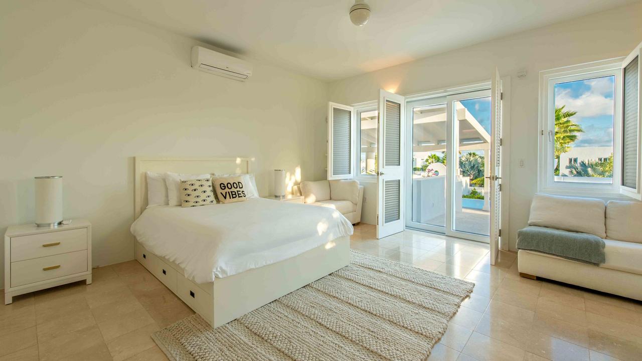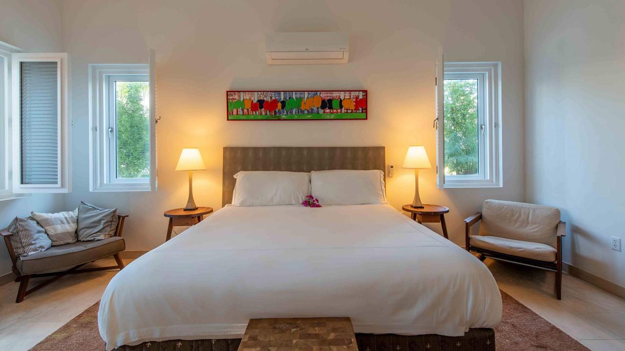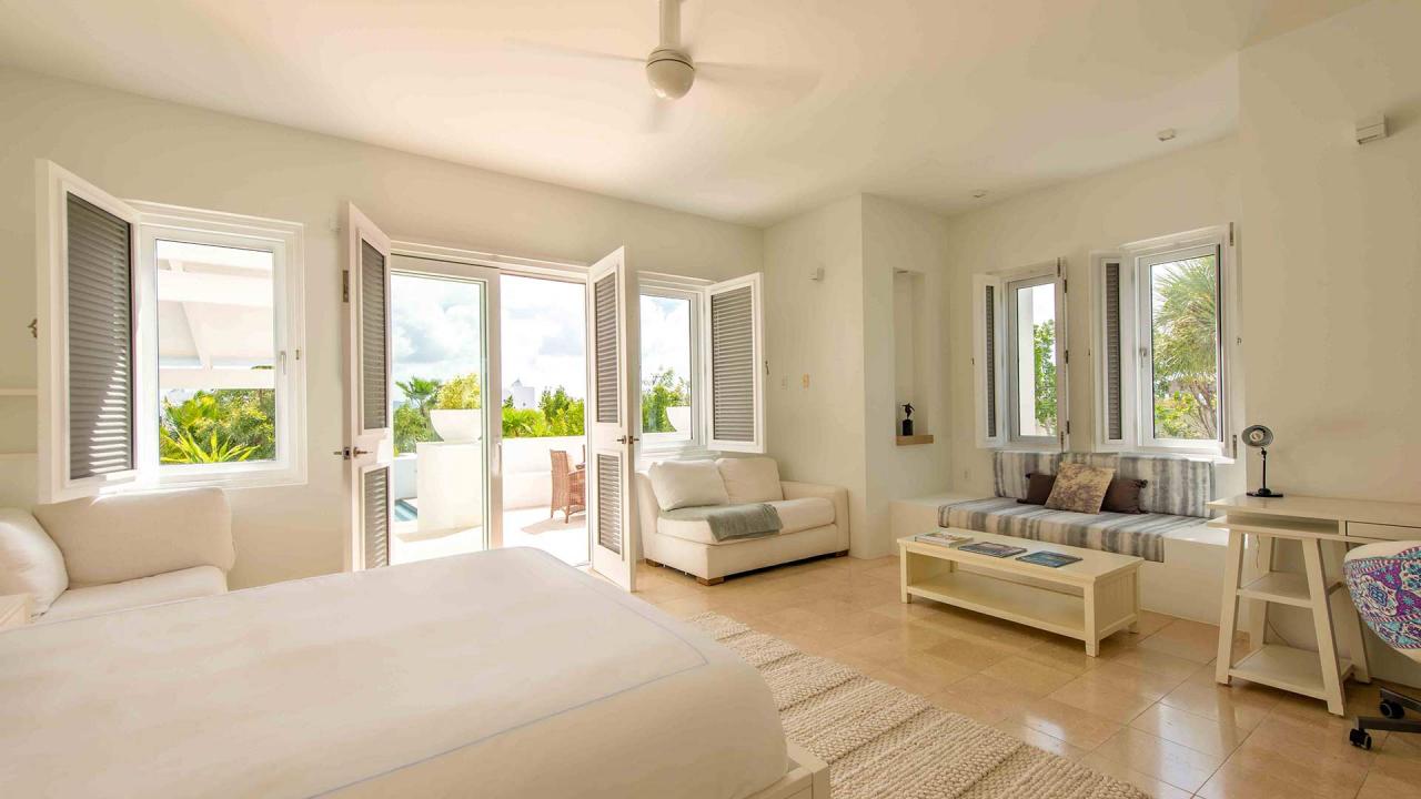 Bedroom 3 - Orchid: This room is located on the upper level and is equipped with a king-sized bed, air conditioning, a ceiling fan, a television, a desk, a sofa, a double terrace, and an ensuite bathroom with a freestanding bathtub, indoor and outdoor walk-in rain shower, double vanities, and a walk-in closet.