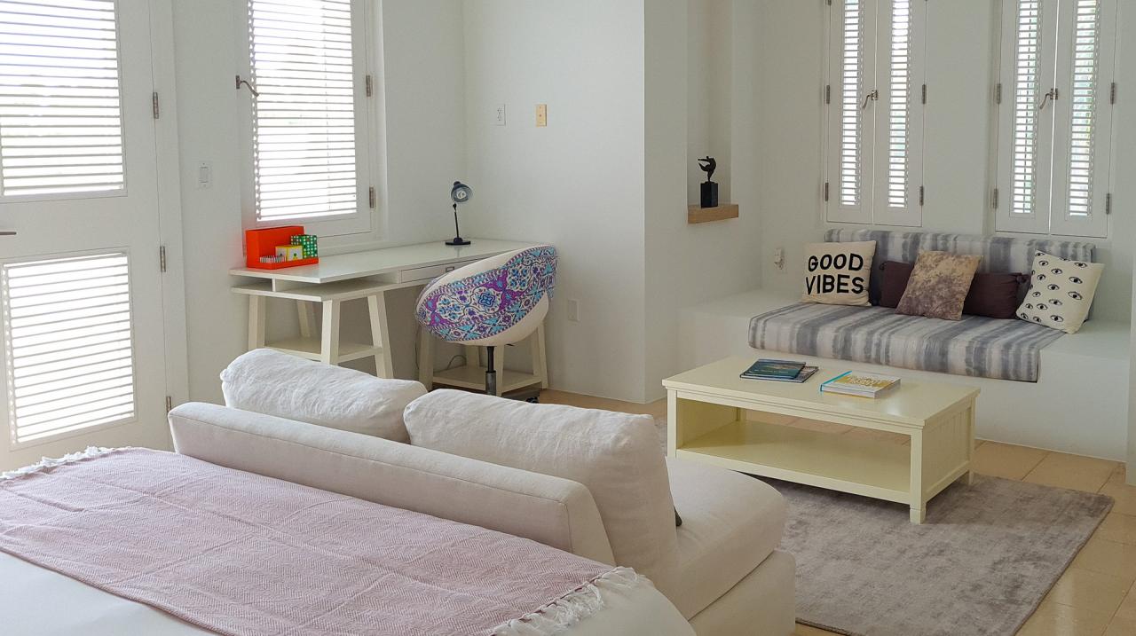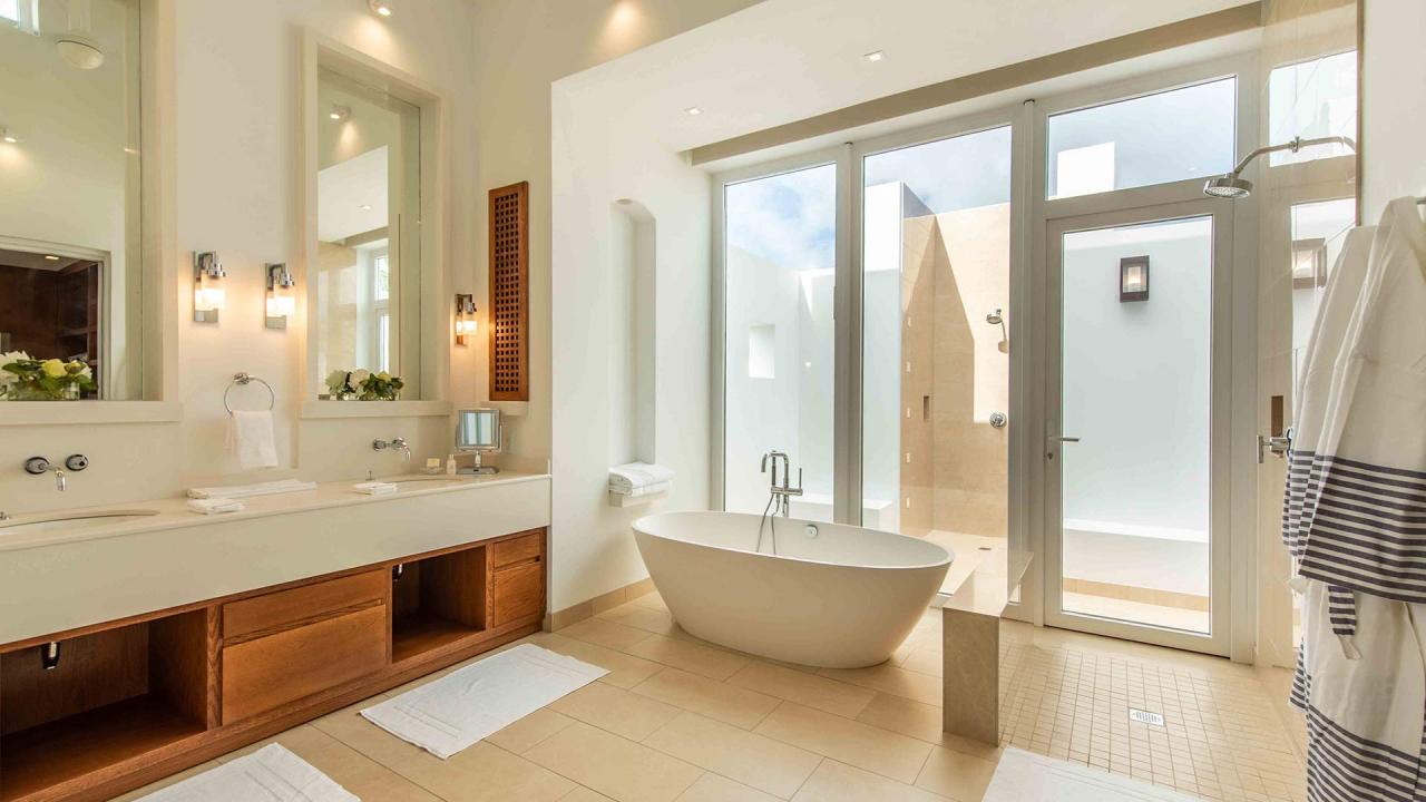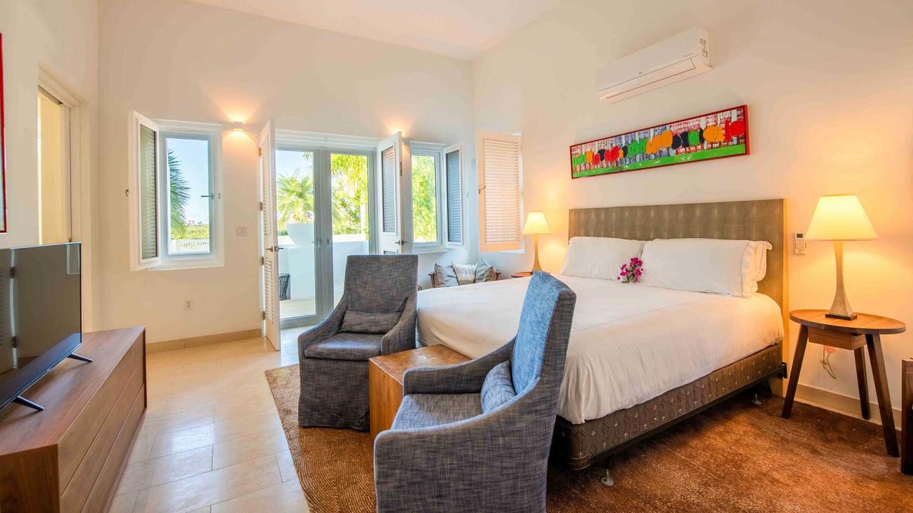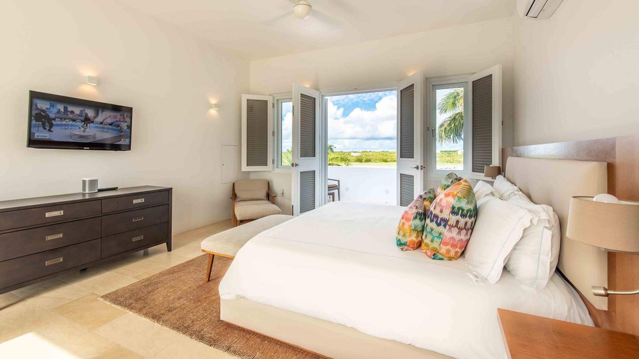 Bedroom 3 - Orchid: This room is located on the upper level and is equipped with a king-sized bed, air conditioning, a ceiling fan, a television, a desk, a sofa, a double terrace, and an ensuite bathroom with a freestanding bathtub, indoor and outdoor walk-in rain shower, double vanities, and a walk-in closet.