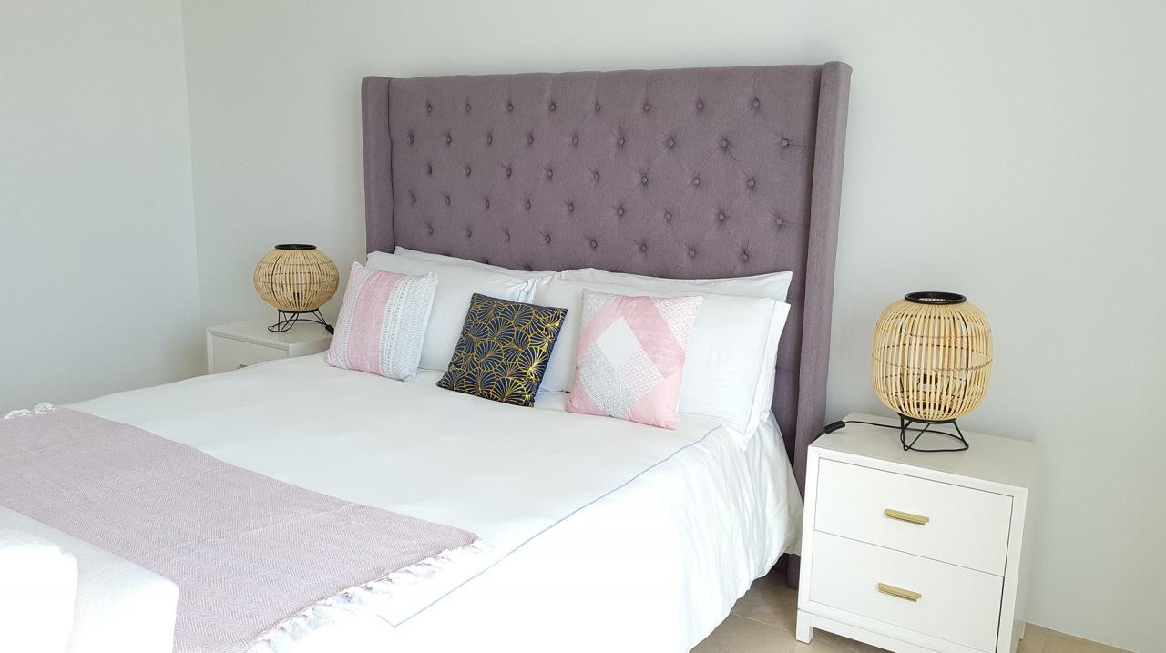 Bedroom 2 - Jasmine: This room is located on the lower level and is equipped with a king-sized bed, air conditioning, a ceiling fan, a desk, a sitting area, and an ensuite bathroom with a freestanding bathtub, indoor and outdoor shower, a double vanity, and a walk-in closet. This room has garden access.