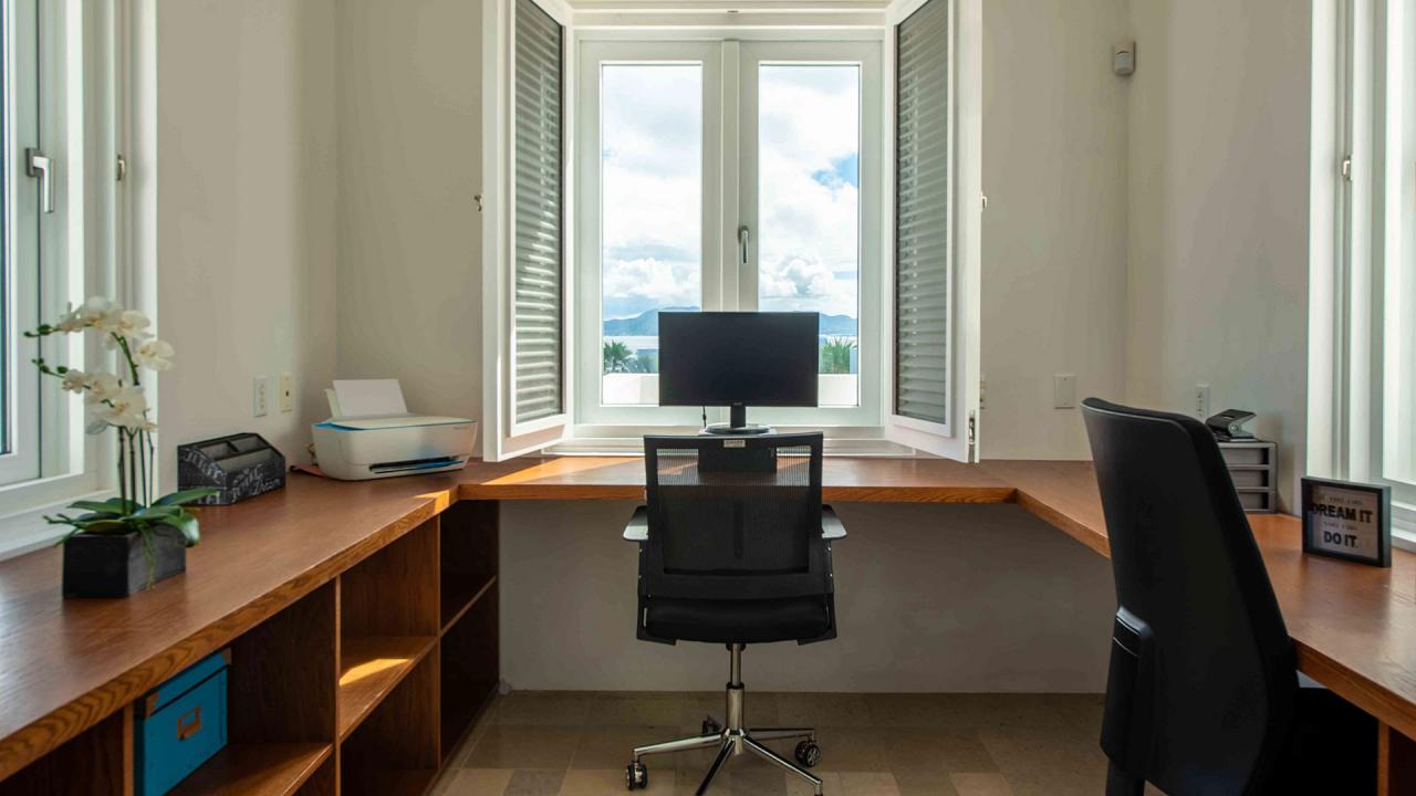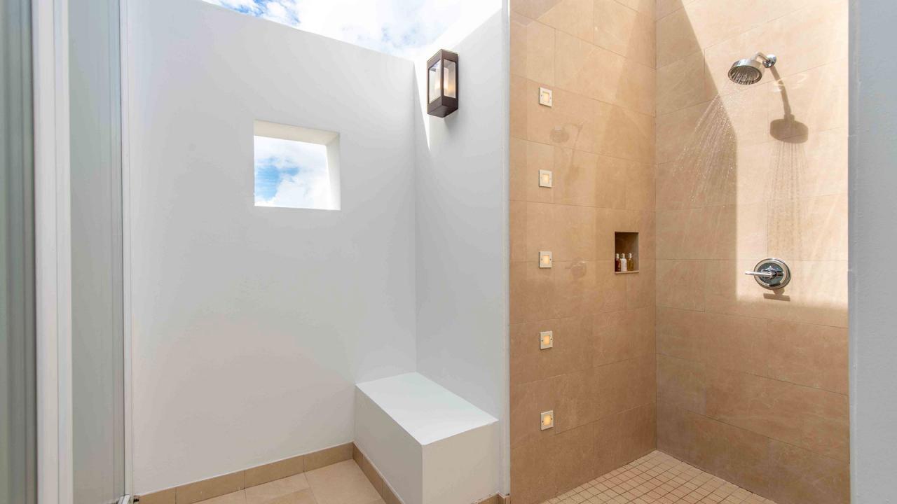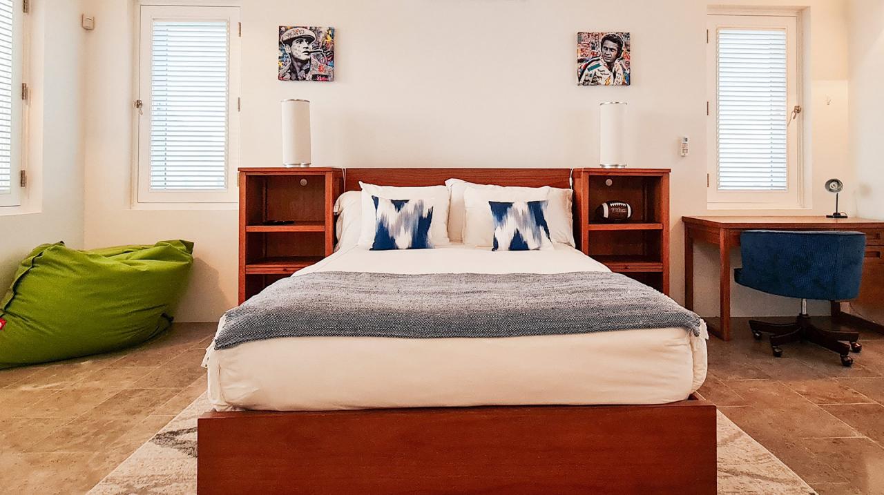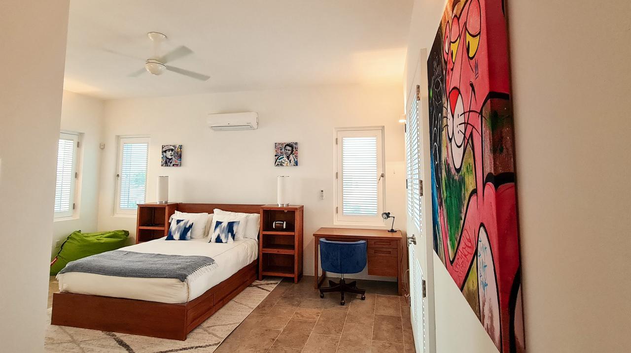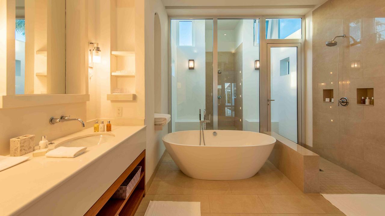 Bedroom 1 - Hibiscus: This room is located on the lower level and is equipped with a king-sized bed, air conditioning, a ceiling fan, a desk, a sitting area, and an ensuite bathroom with a freestanding bathtub, outdoor shower, and a walk-in closet. This room opens onto the pool terrace.