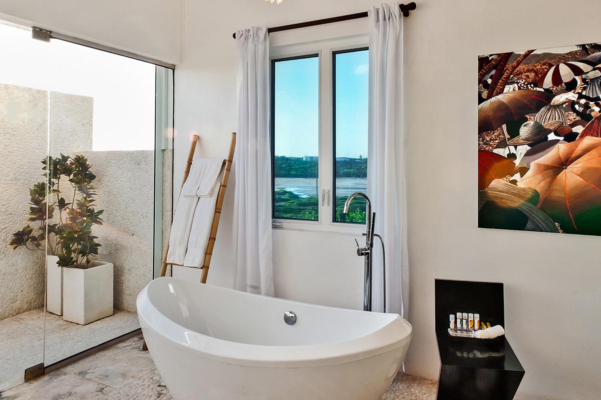 Bedroom 2: This room is located on the upper level and is equipped with a king-sized bed, a safe, air conditioning, a ceiling fan, a television, a desk, and an ensuite bathroom with an enclosed walk-in alfresco rain shower, a freestanding bathtub, and double vanities. Bedroom 2 also opens onto a private furnished balcony with sea views.