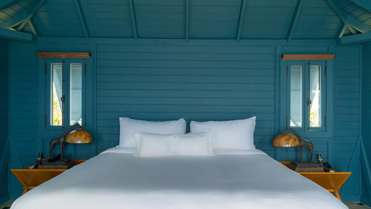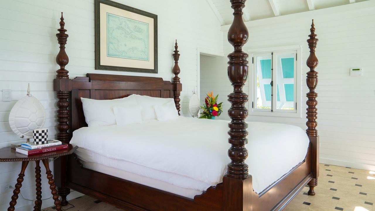Bedroom 1: This room is located in the Main House on the upper level. This room is equipped with a king-sized bed, a walk-in closet, air conditioning, a television, and an ensuite bathroom with a walk-in shower, a freestanding bathtub, and double vanities. Bedroom 1 also opens onto a furnished balcony with views of the Caribbean Sea and St Maarten in the distance.
