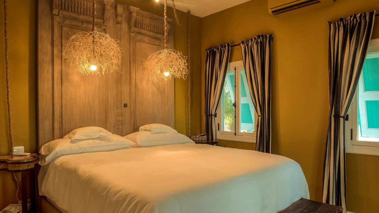 Bedroom 4: This room is located in the Pool House on the upper level. This room is equipped with a king-sized bed, a walk-in closet, air conditioning, and an ensuite bathroom with a walk-in shower and double vanities. Bedroom 4 also opens onto a furnished balcony with views of the Caribbean Sea and St Maarten in the distance.
