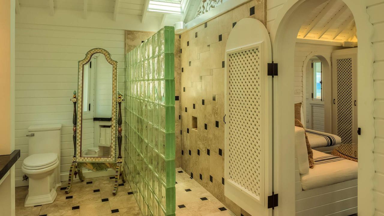 Bedroom 2: This room is located in the Main House on the lower level. This room is equipped with a king-sized bed, air conditioning, a television, and an ensuite bathroom with a shower. Bedroom 2 also opens onto a furnished terrace with views of the Caribbean Sea.