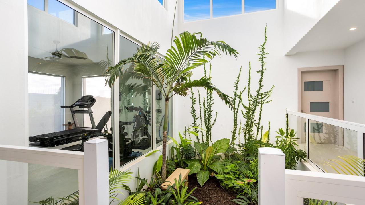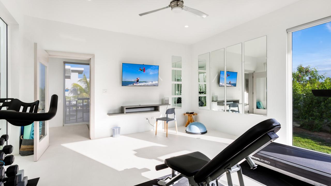 Just under the surface of Villa Alkera, built on Anguilla's limestone rock, there is a partially underground recreational area with vaulted ceilings, dark earthy tones, low lighting, and exposed limestone that create a contrasting escape. There is also a cozy adjacent private office that allows guests to work while still embracing ocean views if necessary. This Caribbean escape also has an in-home gym for guests to work out on vacation. Villa Alkera is a great place for guests to relax and unwind.