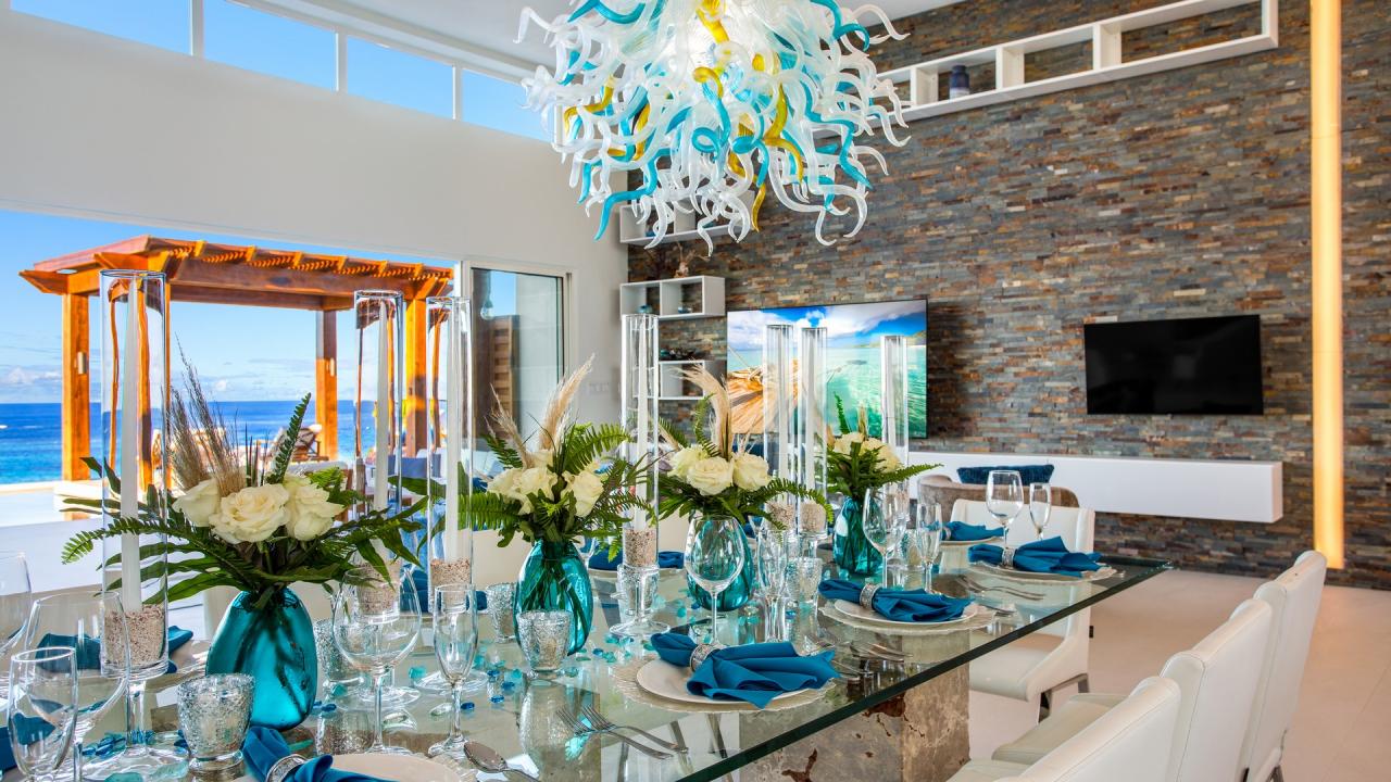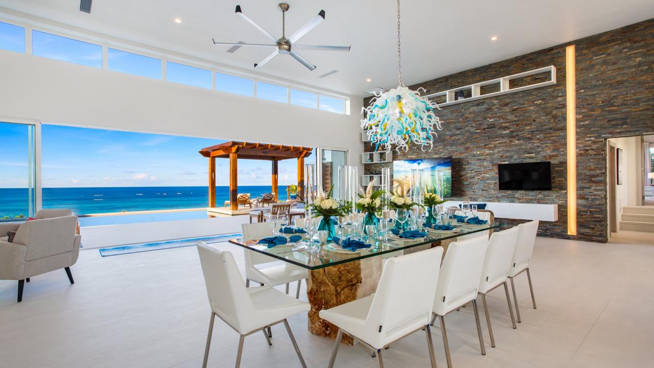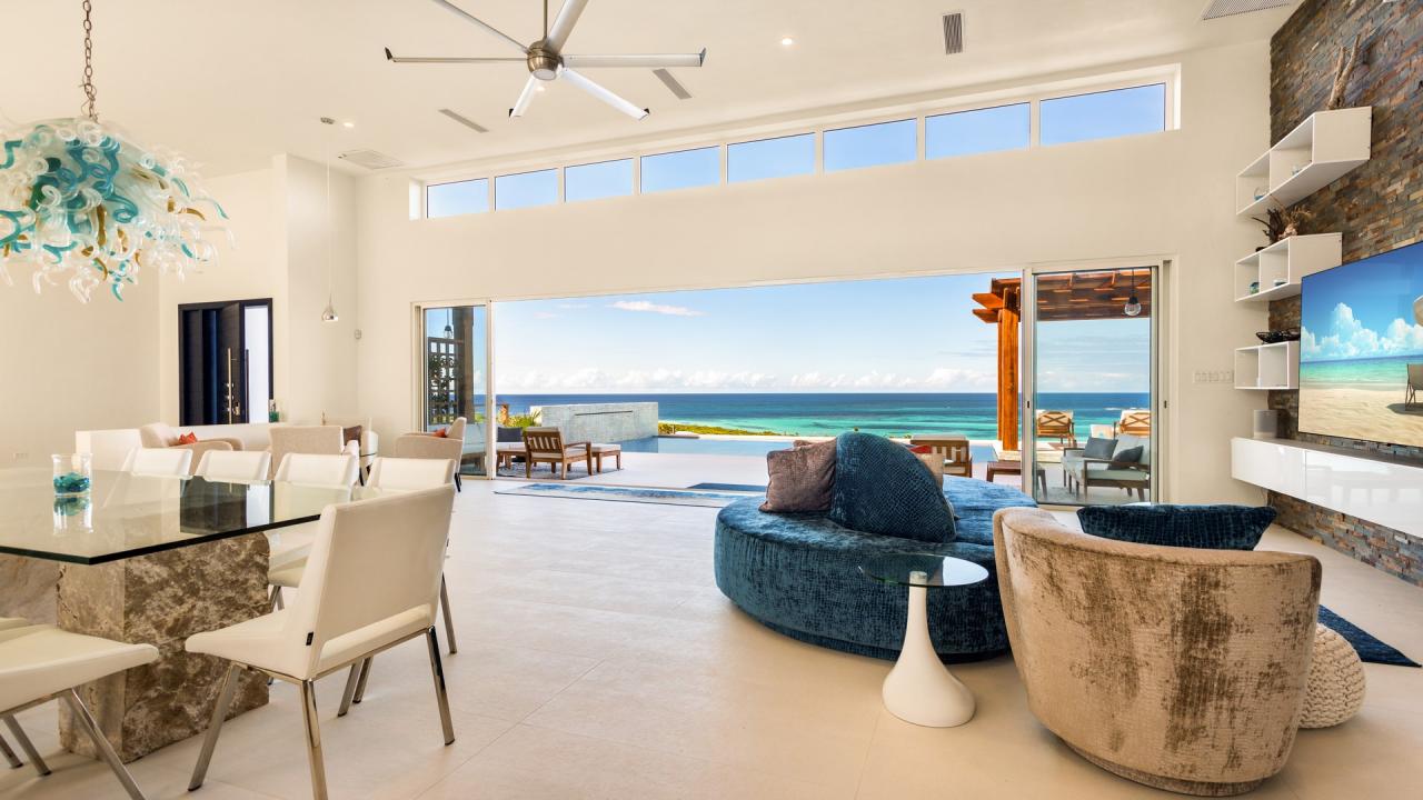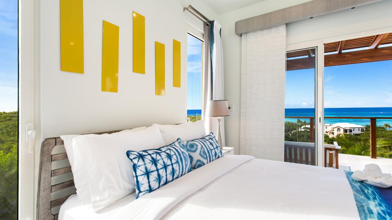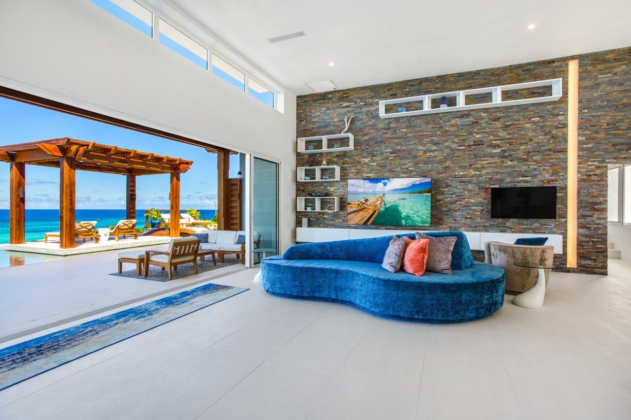 With five bedrooms and six bathrooms, Villa Alkera holds strong to its ocean allure by exuding modern energy with bold, striking color pairings of ocean blue patterns and hues. Each bedroom has decor that embraces the overall ocean theme charm of Villa Alkera. The kitchen is fully equipped with a double oven, a hidden integrated fridge/freezer, a full gas range and grill, a coffee maker, and everything else needed for guests to serve up a warm and delicious meal. The villa's massive panel doors, panoramic ocean views, walk-in closets, walk-out patios, and self-contained kitchen units vary between rooms.