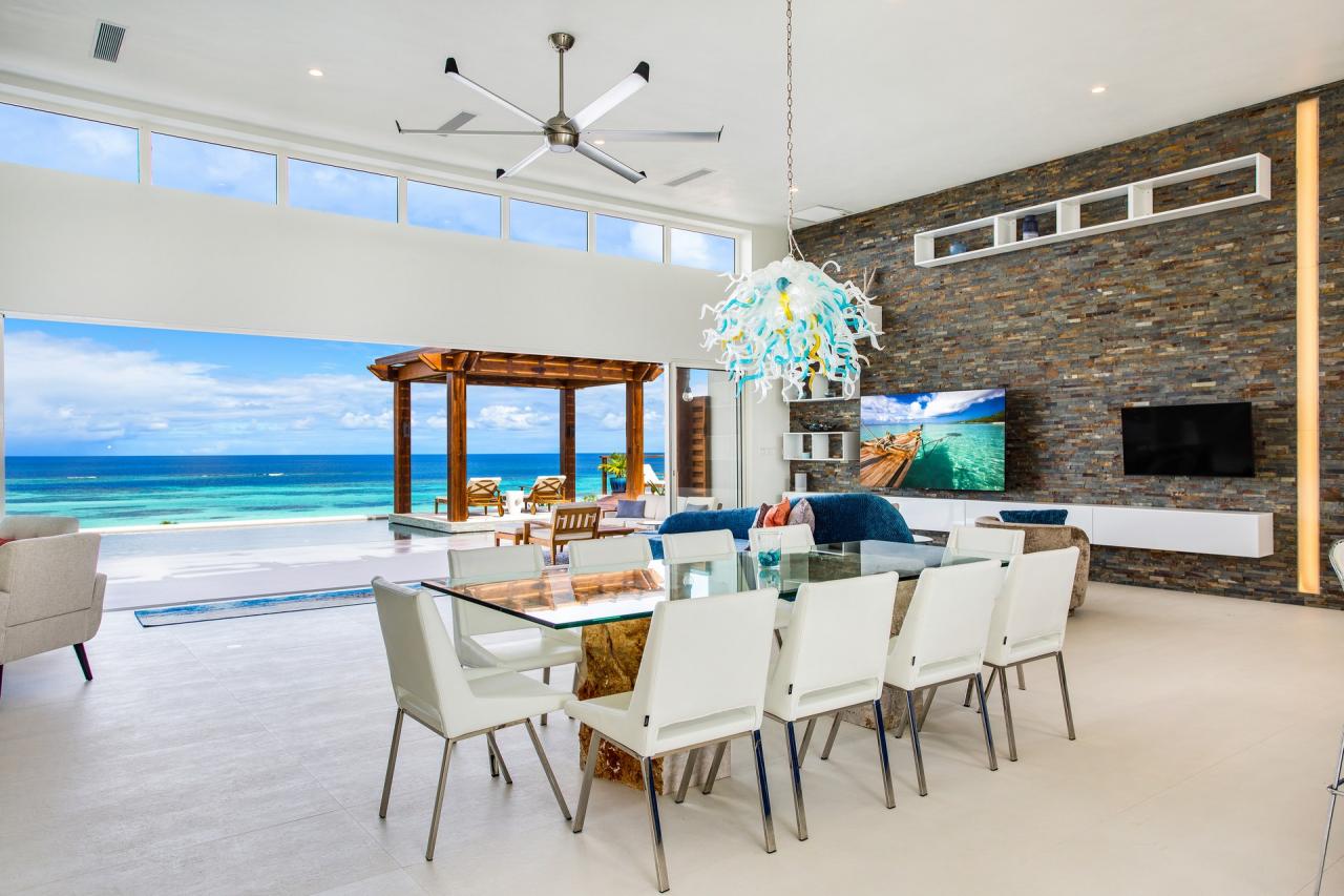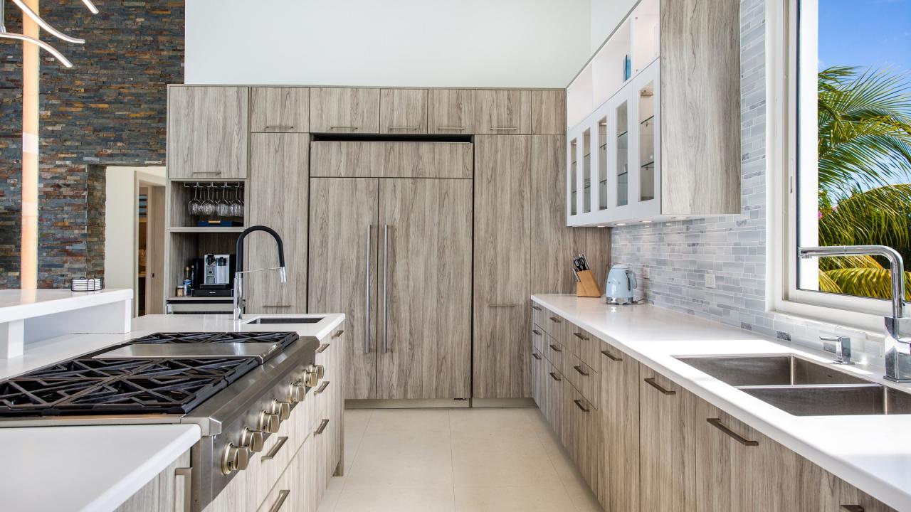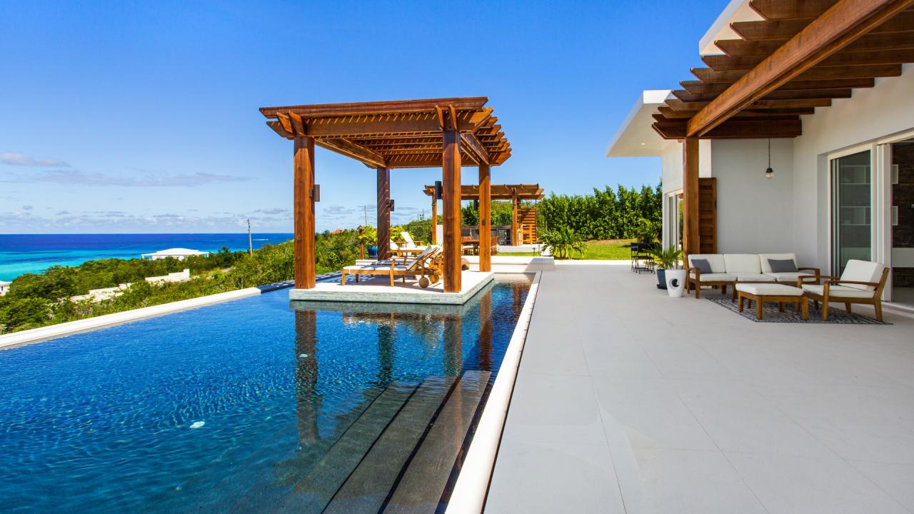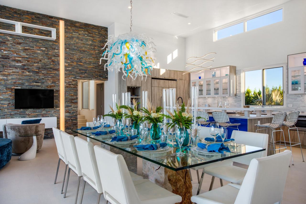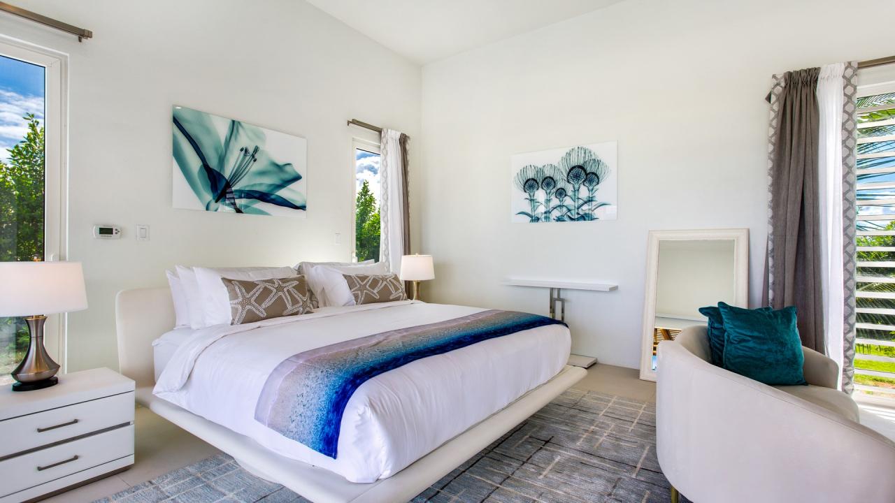 With five bedrooms and six bathrooms, Villa Alkera holds strong to its ocean allure by exuding modern energy with bold, striking color pairings of ocean blue patterns and hues. Each bedroom has decor that embraces the overall ocean theme charm of Villa Alkera. The kitchen is fully equipped with a double oven, a hidden integrated fridge/freezer, a full gas range and grill, a coffee maker, and everything else needed for guests to serve up a warm and delicious meal. The villa's massive panel doors, panoramic ocean views, walk-in closets, walk-out patios, and self-contained kitchen units vary between rooms.