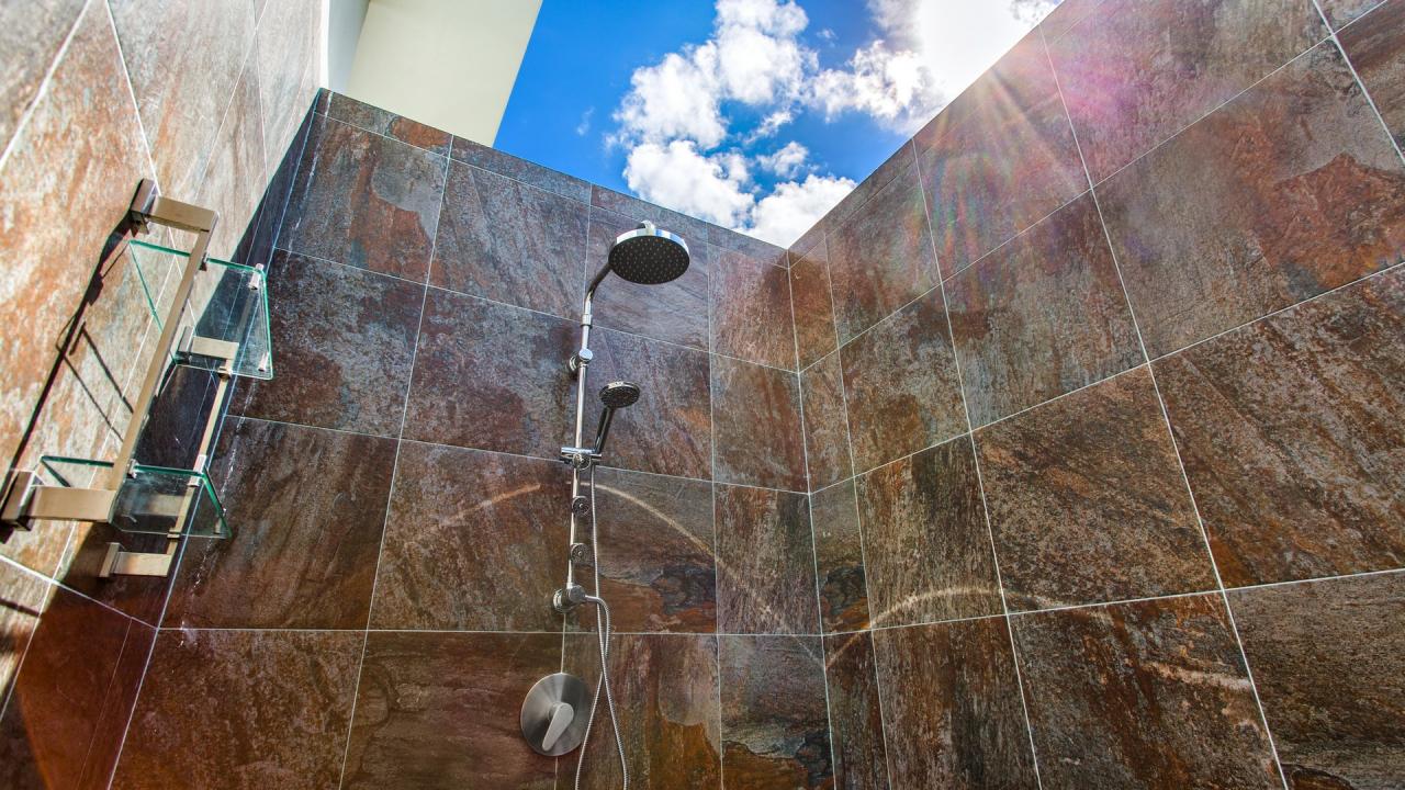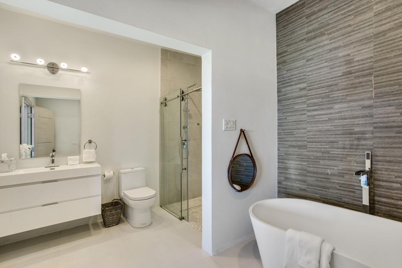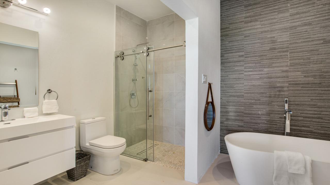 Primary Bedroom: This room is equipped with a king-sized bed and an ensuite bathroom with two sinks and an additional outdoor shower. Primary Bedroom also has ocean views and exterior access.