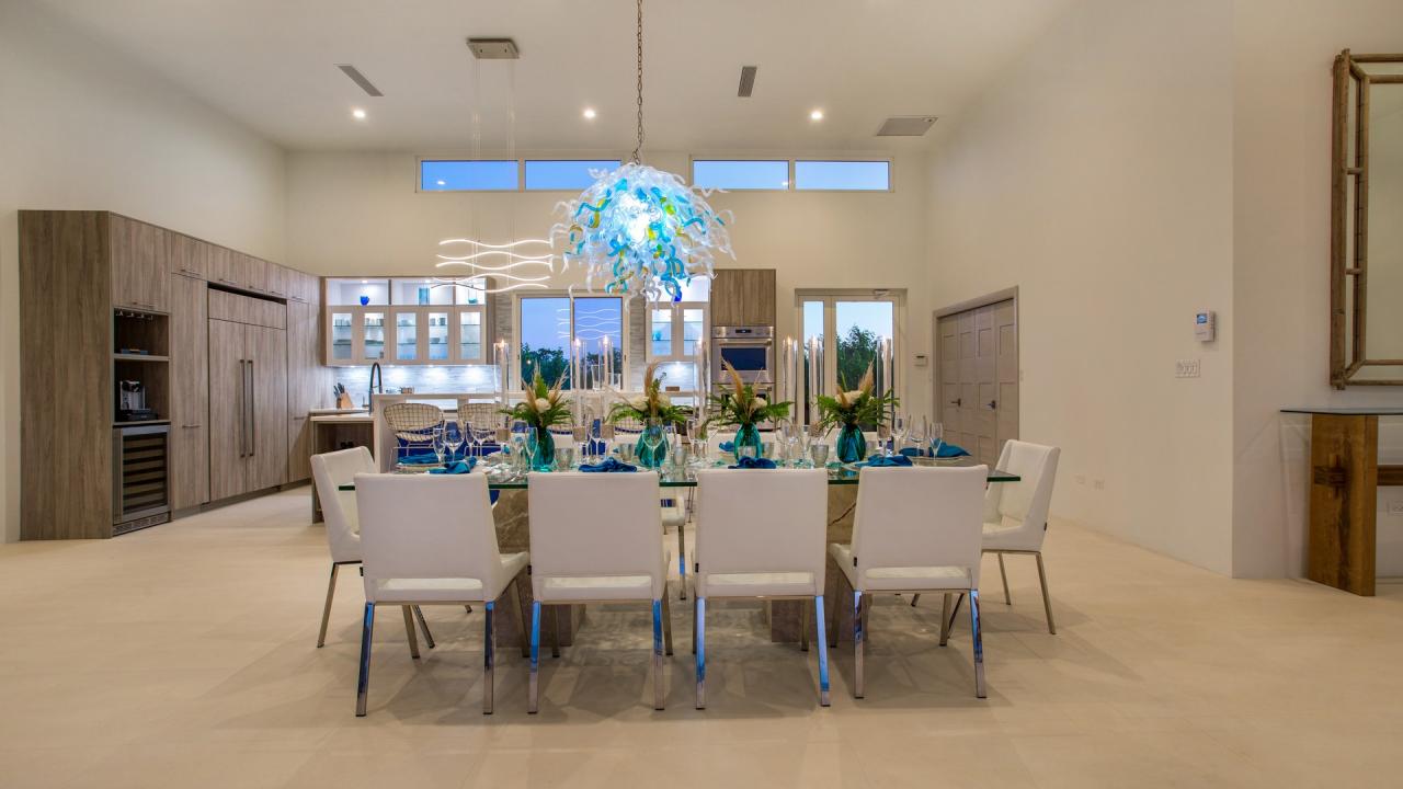 This villa in Anguilla blends indoor and outdoor living seamlessly for guests to enjoy their experience in the Caribbean. There are extensive glass panels, high ceilings, and an open-concept interior that give guests amazing views of brilliant sunrises and sunsets. The open living and dining area moves onto an outdoor patio space that leads directly into the focal heated infinity-edge pool. The pool dissolves into the view of the ocean, which creates seamless views of gorgeous blues. The pool has a floating island platform that allows guests to lounge in the infinity pool. The outdoor kitchen, bar, and dining area sit by the lush front garden for al fresco dining. The open-air shower and an indoor garden help accentuate Alkera's identity as a gateway that hovers the lines of indoor/outdoor living.