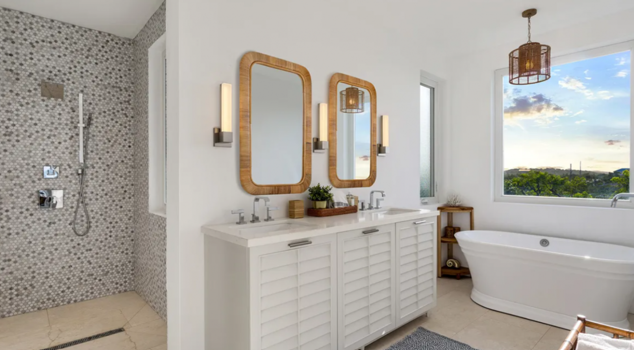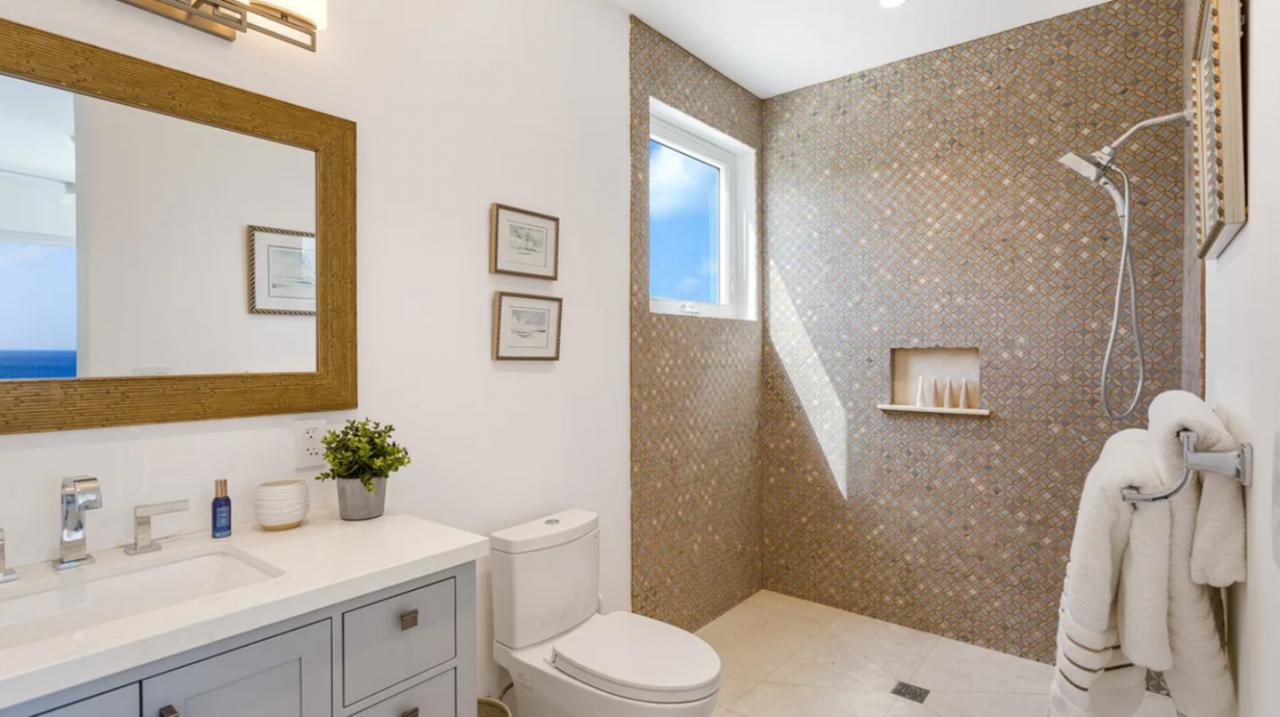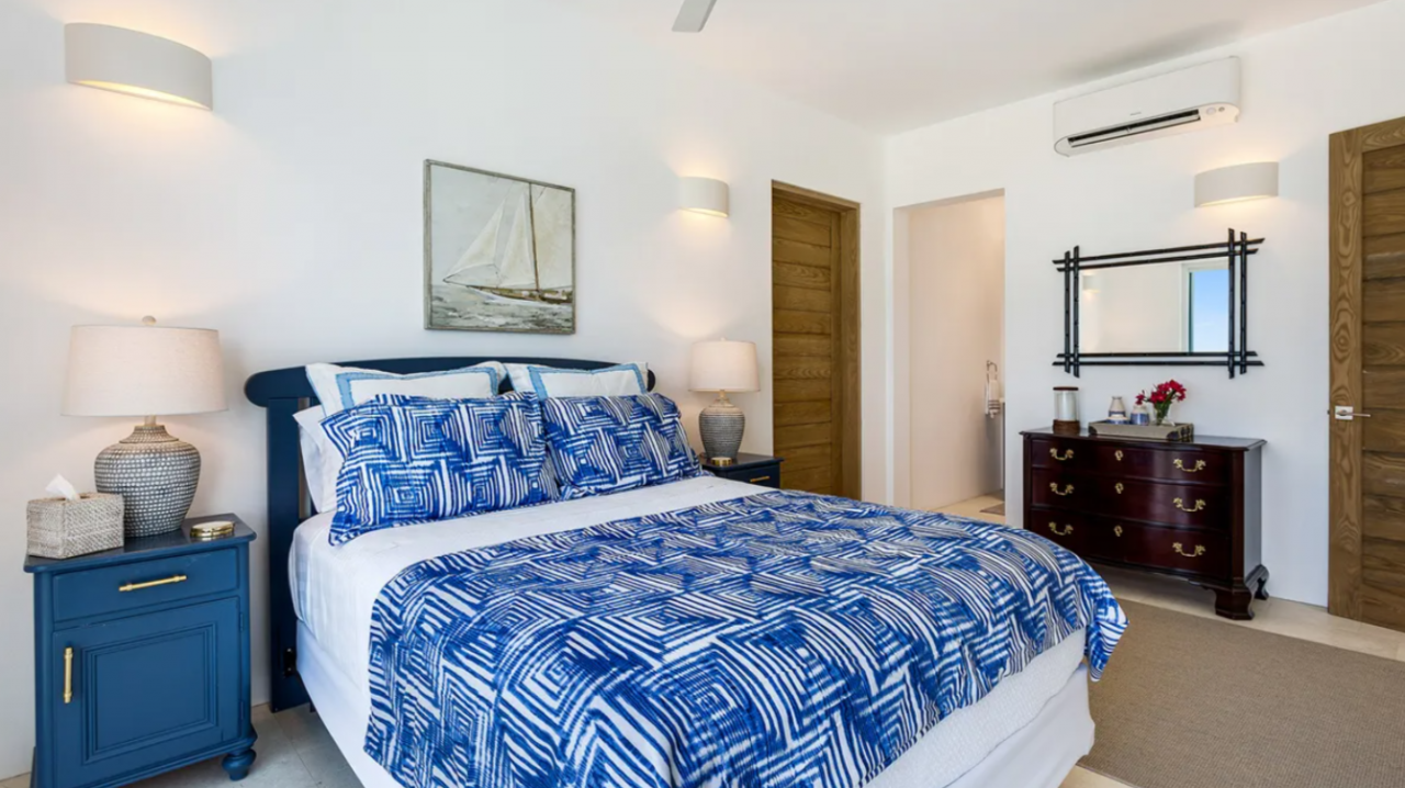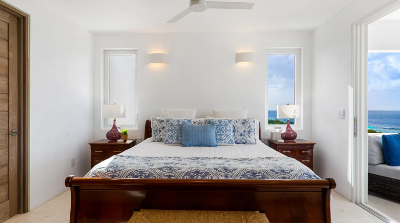 Main Bedroom 1: This room is located on the first level and equipped with a king-sized bed, access to a furnished terrace and pool with an ocean view, a ceiling fan, and an ensuite bathroom with a bathtub and shower.