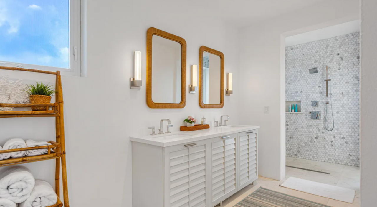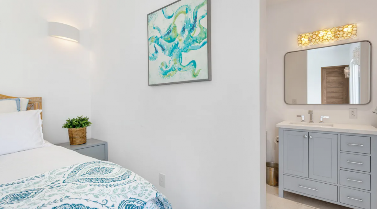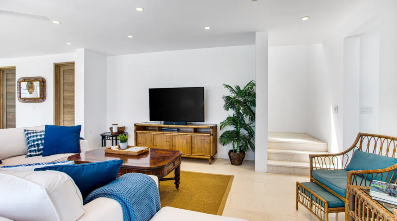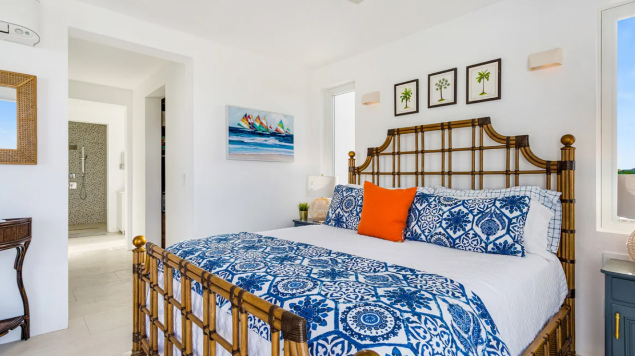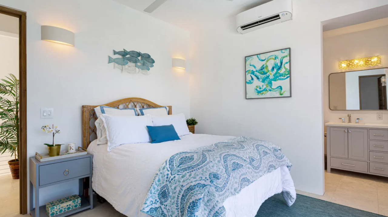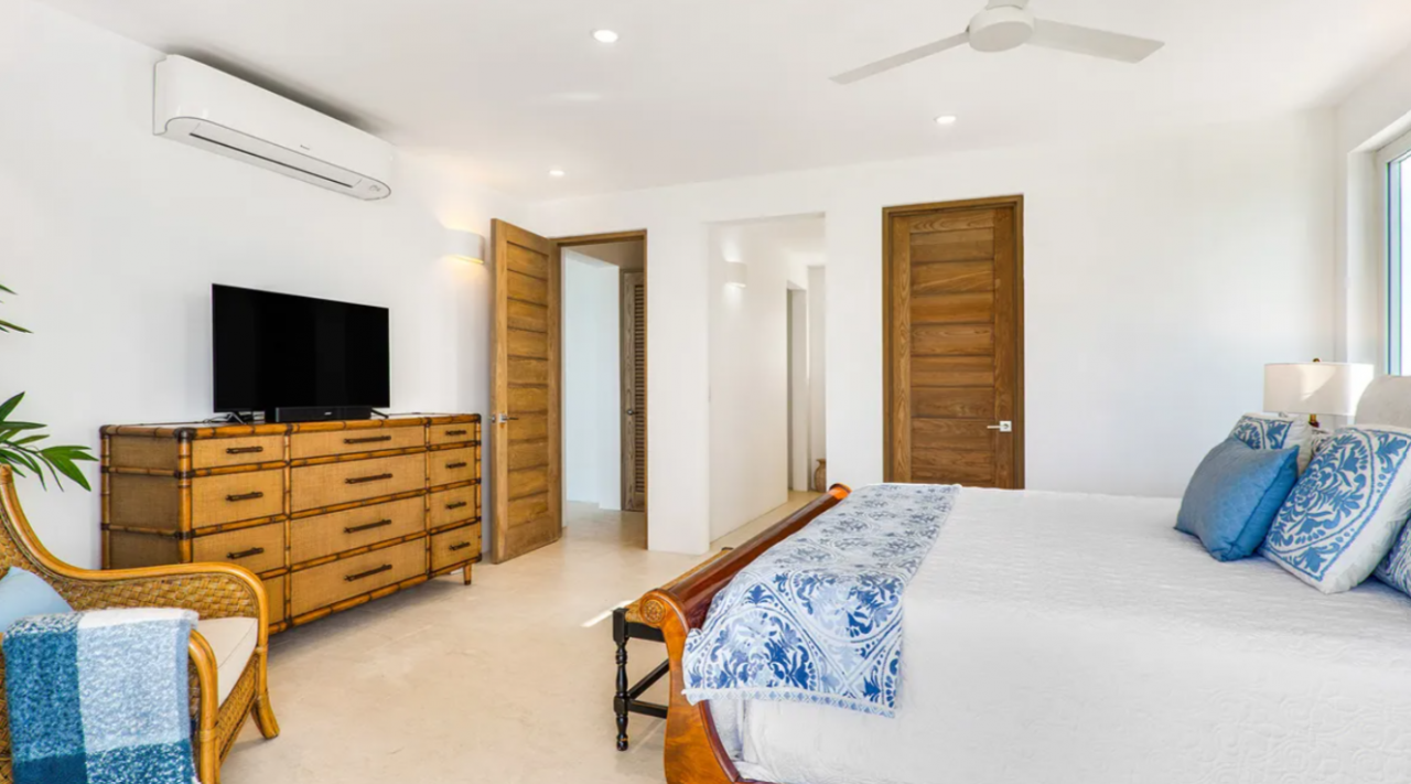 Main Bedroom 2: This room is located on the second level and is equipped with a walk-in closet, air conditioning, a ceiling fan, a television, a private balcony with an ocean view, and an ensuite bathroom with an indoor and outdoor shower.