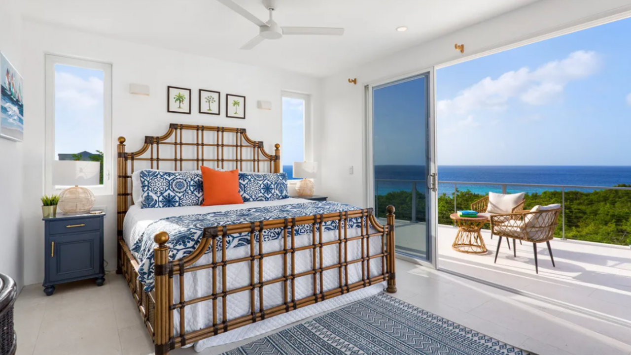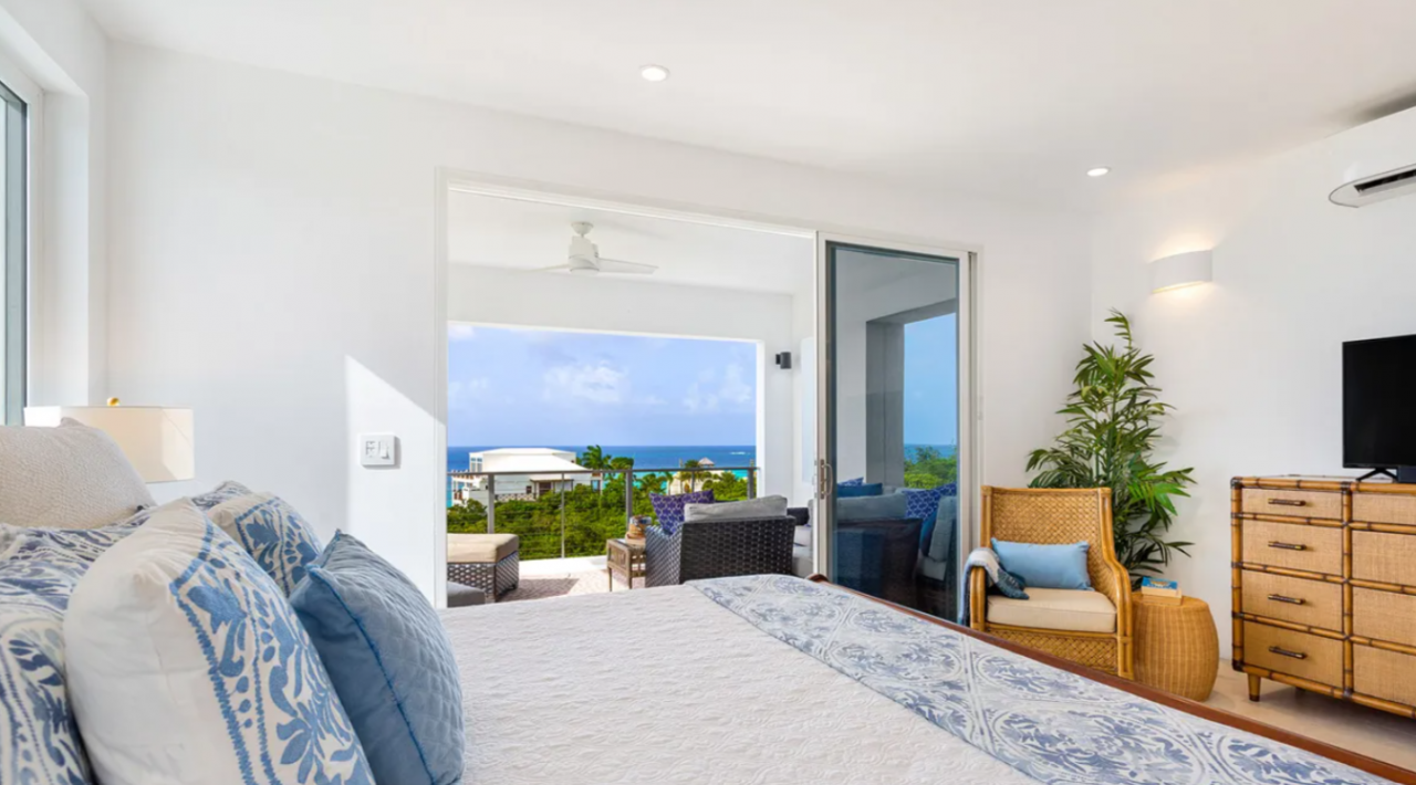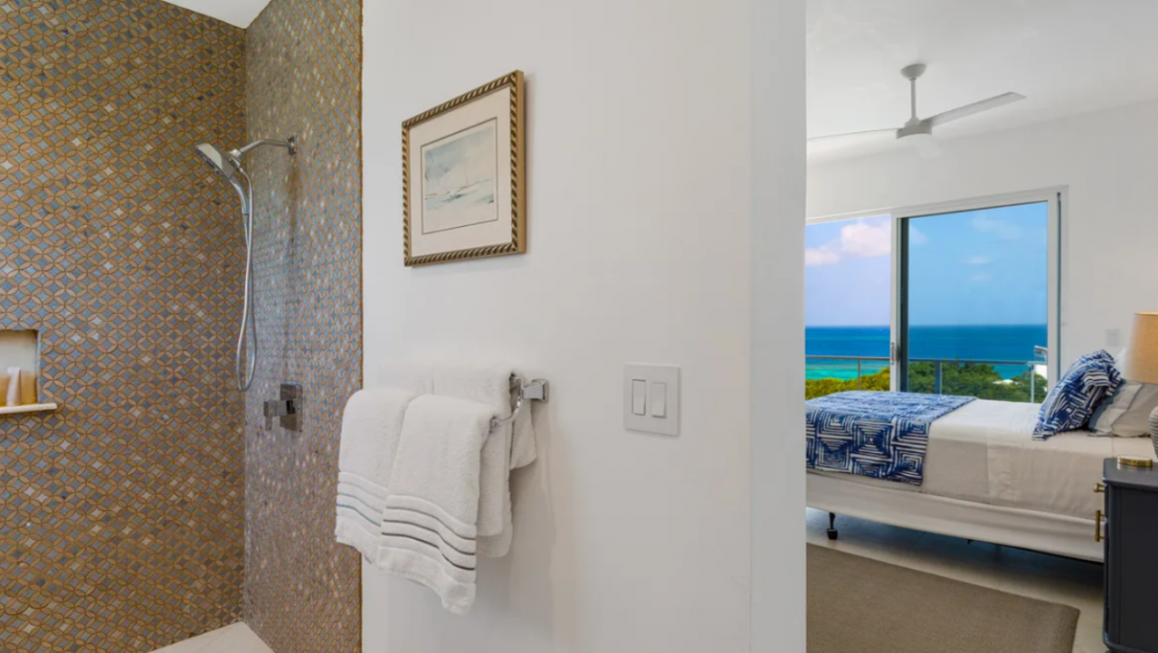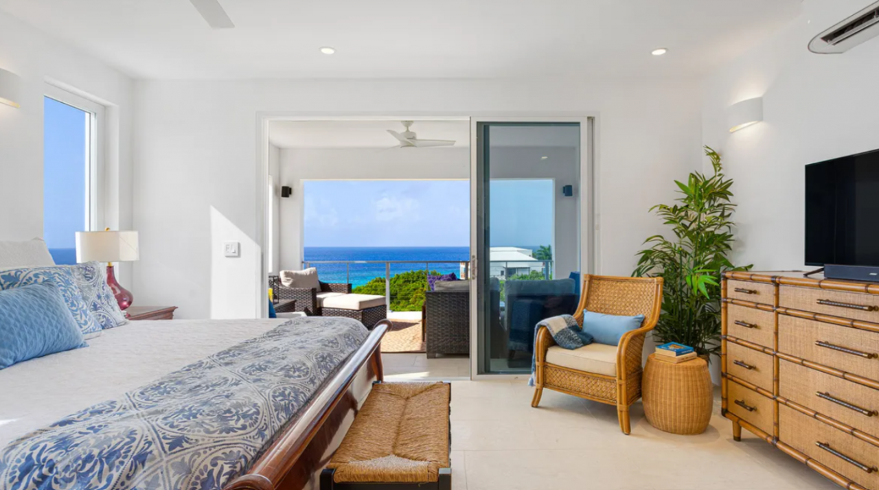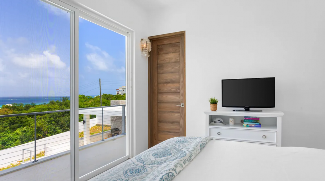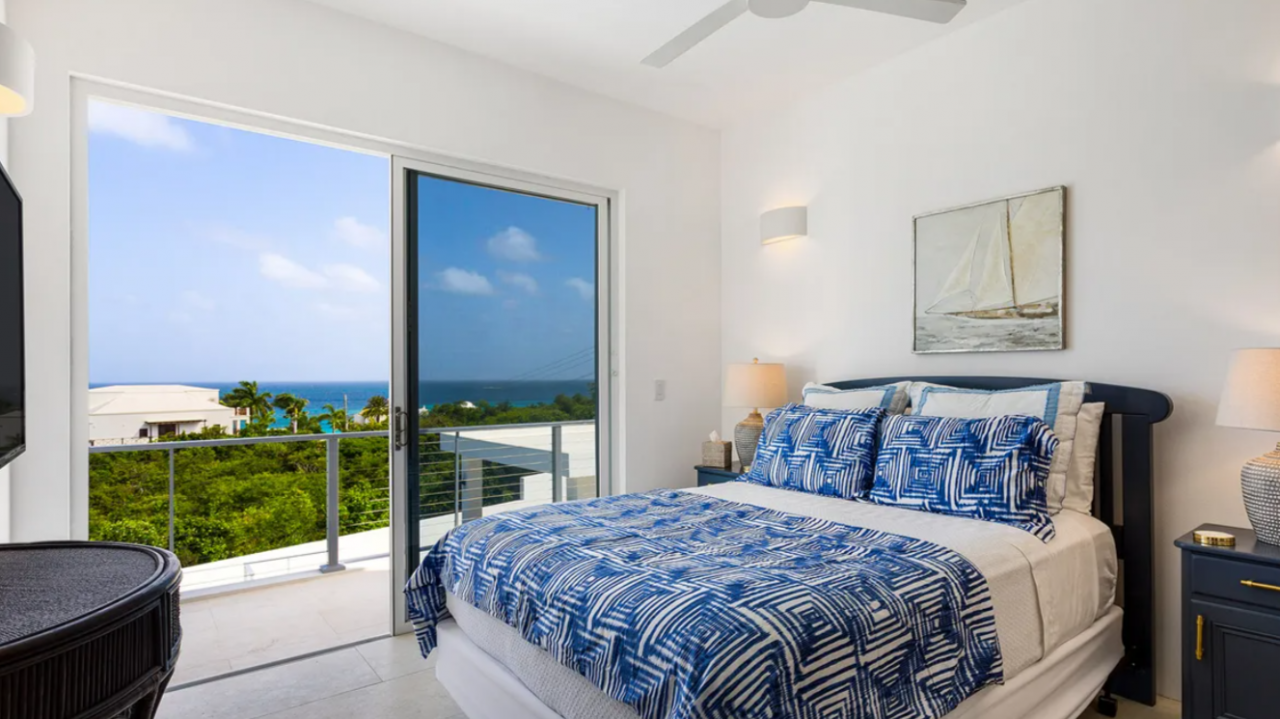 Bedroom 3: This room is located on the second level and is equipped with a queen-sized bed, air conditioning, a ceiling fan, a television, a shared balcony with an ocean view, and an ensuite bathroom with a shower.