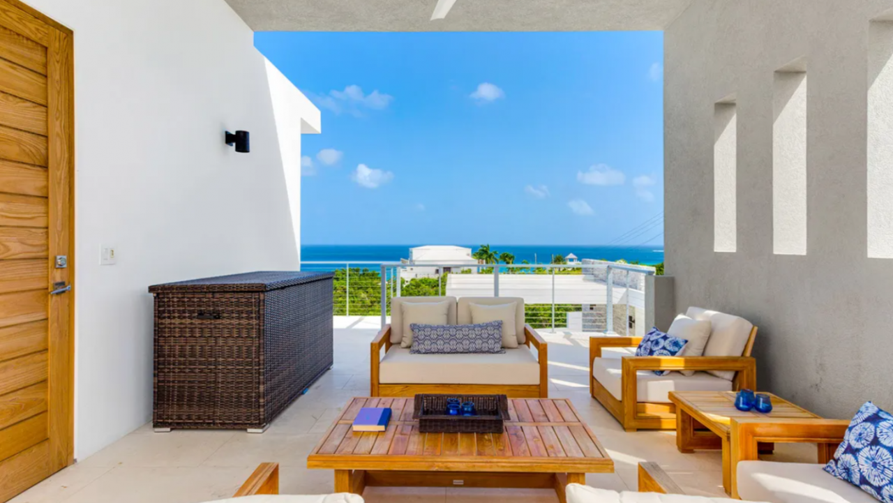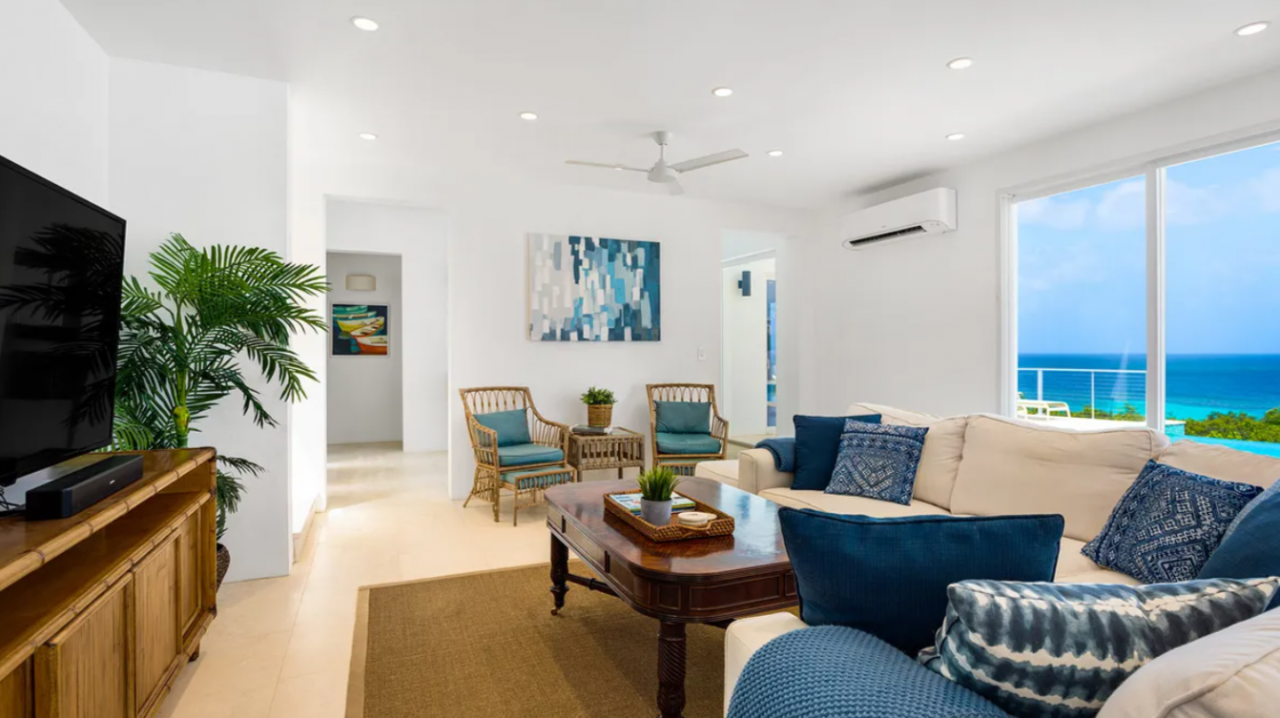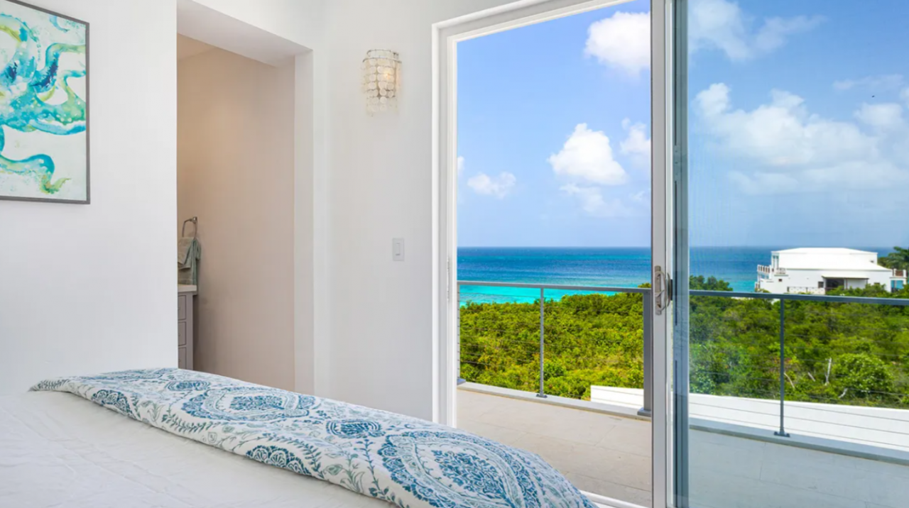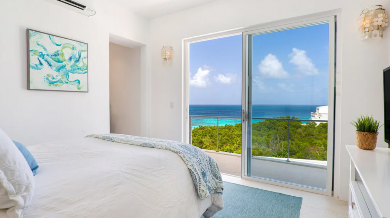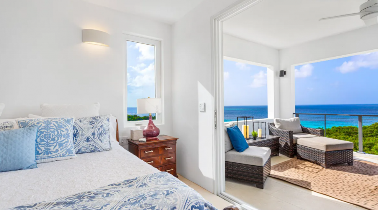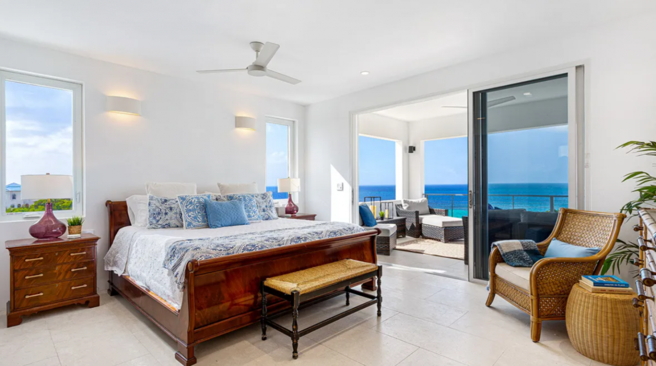 Bedroom 3: This room is located on the second level and is equipped with a queen-sized bed, air conditioning, a ceiling fan, a television, a shared balcony with an ocean view, and an ensuite bathroom with a shower.