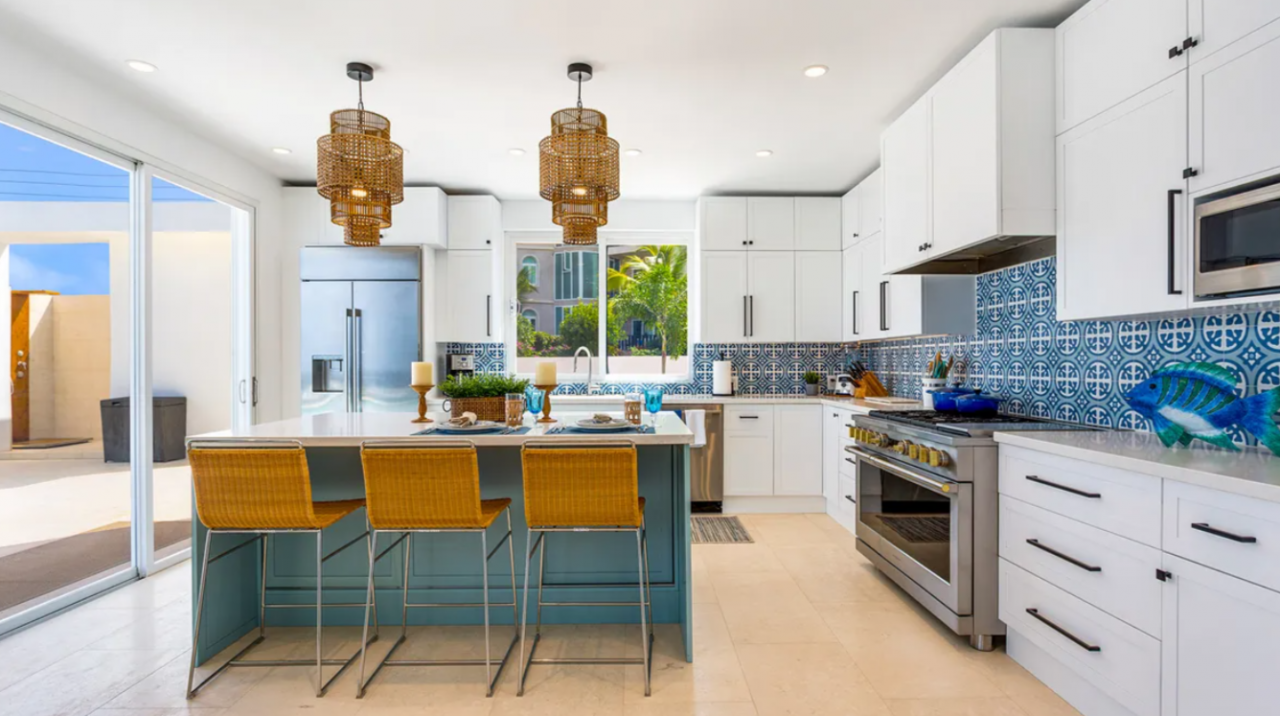 Bathed in natural light, the property embodies a modern and spacious open floor plan featuring a chef’s kitchen, dining area, and living space. This area seamlessly connects to the expansive deck leading to a large infinity pool, creating an inviting atmosphere for relaxation. Numerous lounge areas provide ample space to enjoy the sunshine or seek refuge in the shade of a palm tree.