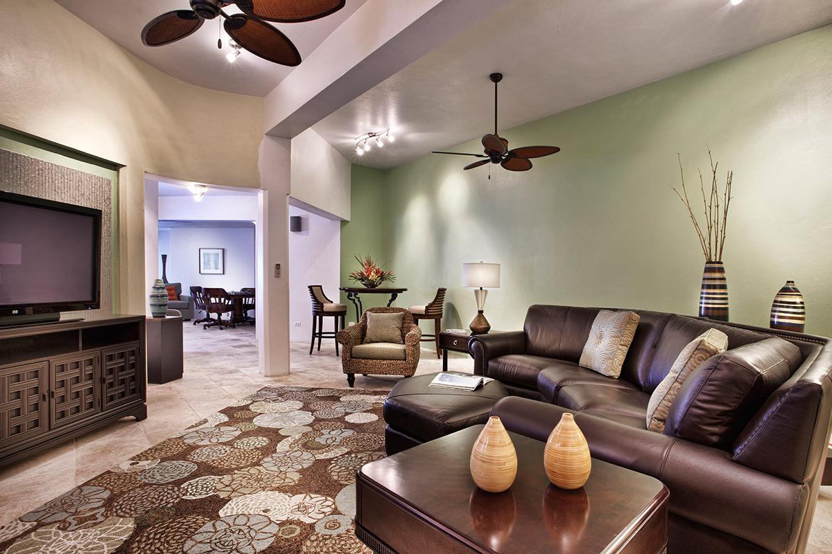 The ground floor offers 3 rooms and a second large pool with hot tub. The rooms are: 1 King ensuite, 1 Queen room and 1 room with 2 twin beds. The twin room and Queen suite share a bathroom. This level houses the sprawling media/entertainment cave with 60" TV, wet bar, poker table, board games and kitchenette - a perfect area for children and grown ups alike to enjoy a day of fun, games and swimming. The very private garden suite with King bed, the 4th room on this level, is complete with kitchenette, dinette, living room with pull-out sofa and a "tunnel" design which leads to a deluxe closet and bathroom.