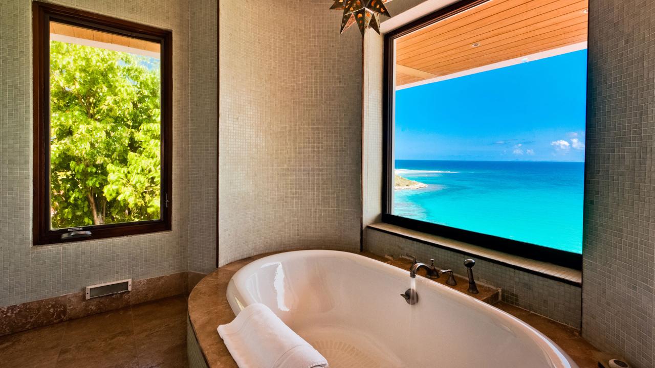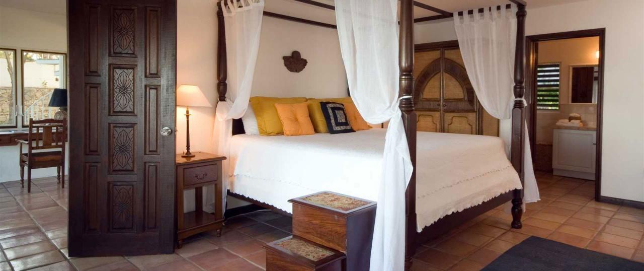 Primary Bedroom: This room is located in the Flamboyant Villa on the upper level. This room is equipped with a king-sized bed, air conditioning, a ceiling fan, a television, a seating area, and an ensuite bathroom with a bathtub and a walk-in shower. The primary bedroom also has a private furnished deck with a sea view.