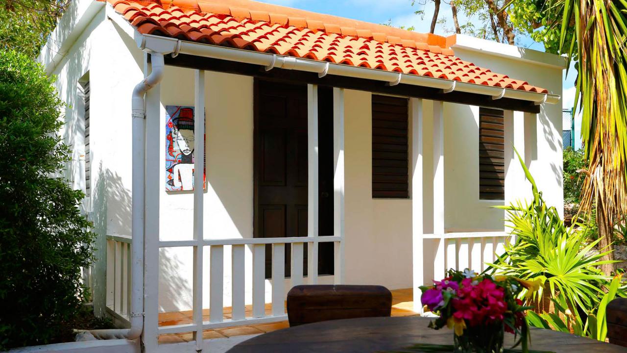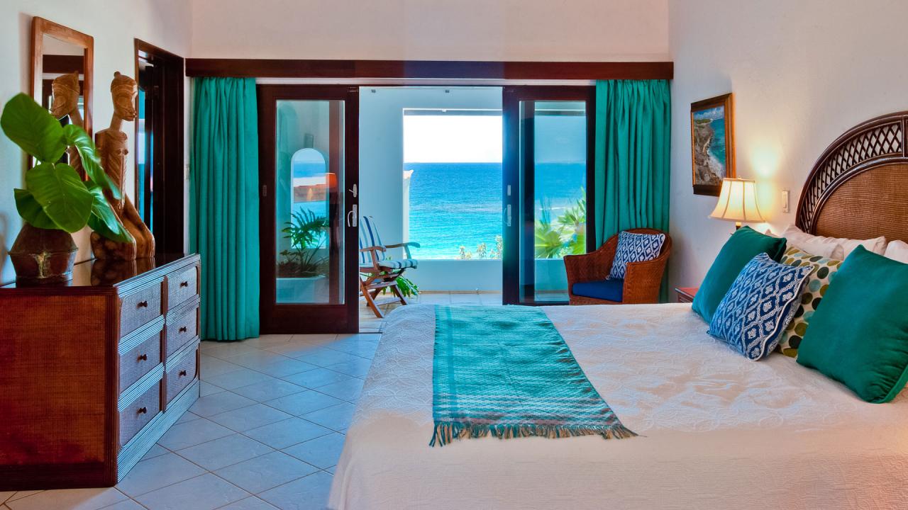 Bedroom 2: This room is located in the Flamboyant Villa on the lower level. This room is equipped with a king-sized bed, air conditioning, a ceiling fan, and an ensuite bathroom with a walk-in shower. Bedroom 2 also has a furnished balcony with a sea view.