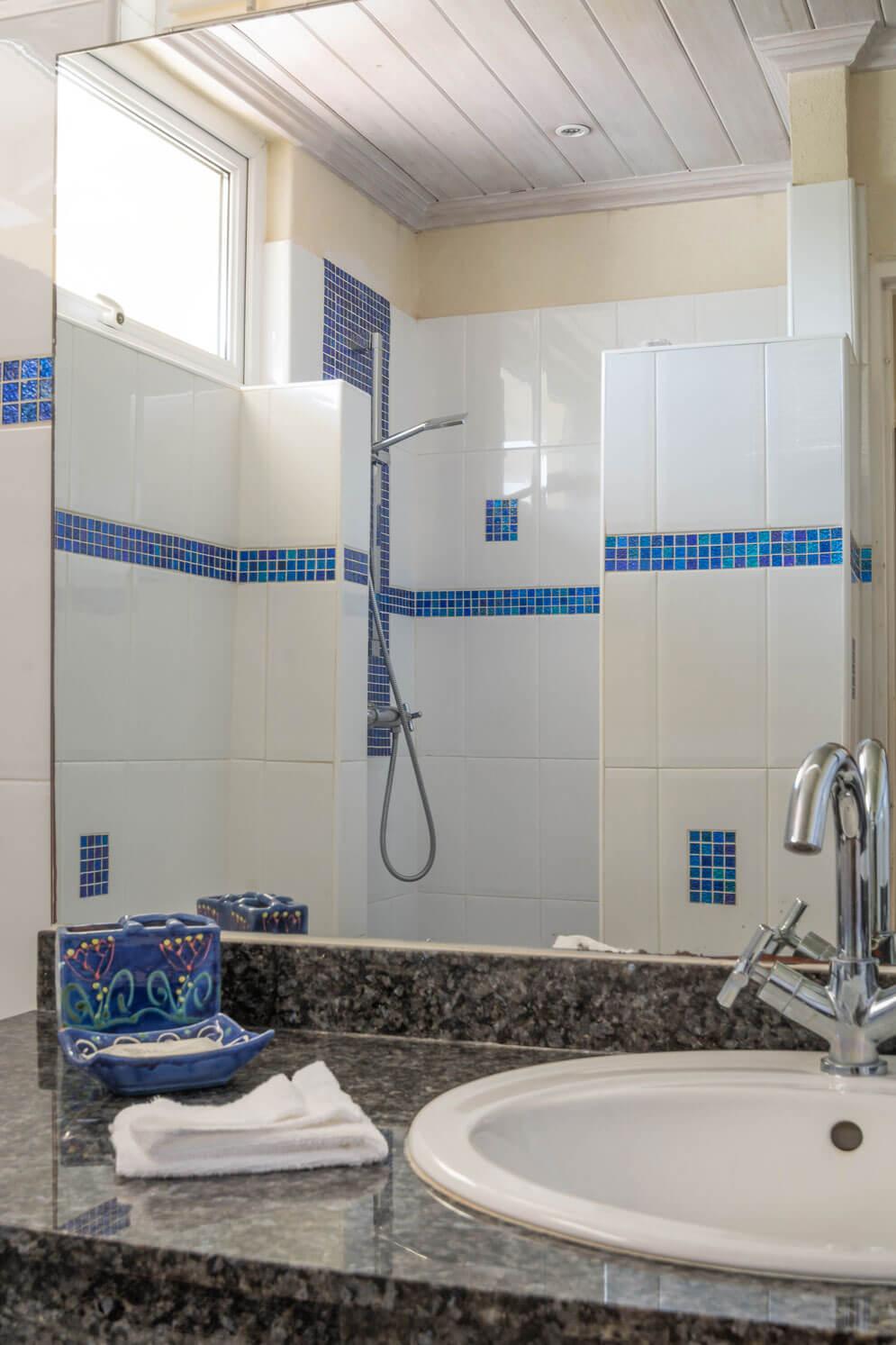 Bedroom 4: This room is equipped with a king-sized bed (which can be converted into two twins), air conditioning, a ceiling fan, a safe, and an ensuite bathroom with a freestanding bath and walk-in shower with a rain shower head. It is wheelchair accessible.