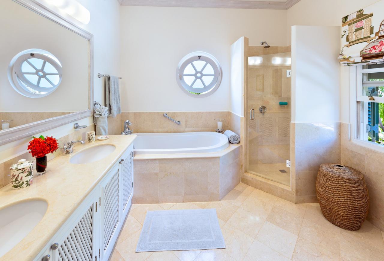 The villa is decorated to a high standard with accents of antique pieces of furniture. The interior, with its coral stone walls, is bright and airy with a large living area that opens onto an expansive covered terrace.There are four bedrooms in the main house, with the fourth in a separate self-contained cottage on the grounds. All bedrooms have air conditioning, ceiling fans, walk-in closets and ensuite bathrooms with marble throughout. The Master bedroom suite upstairs features a separate dressing room with Super king size 4-poster bed. The ensuite bathroom has a bath tub, a separate shower and twin basins.