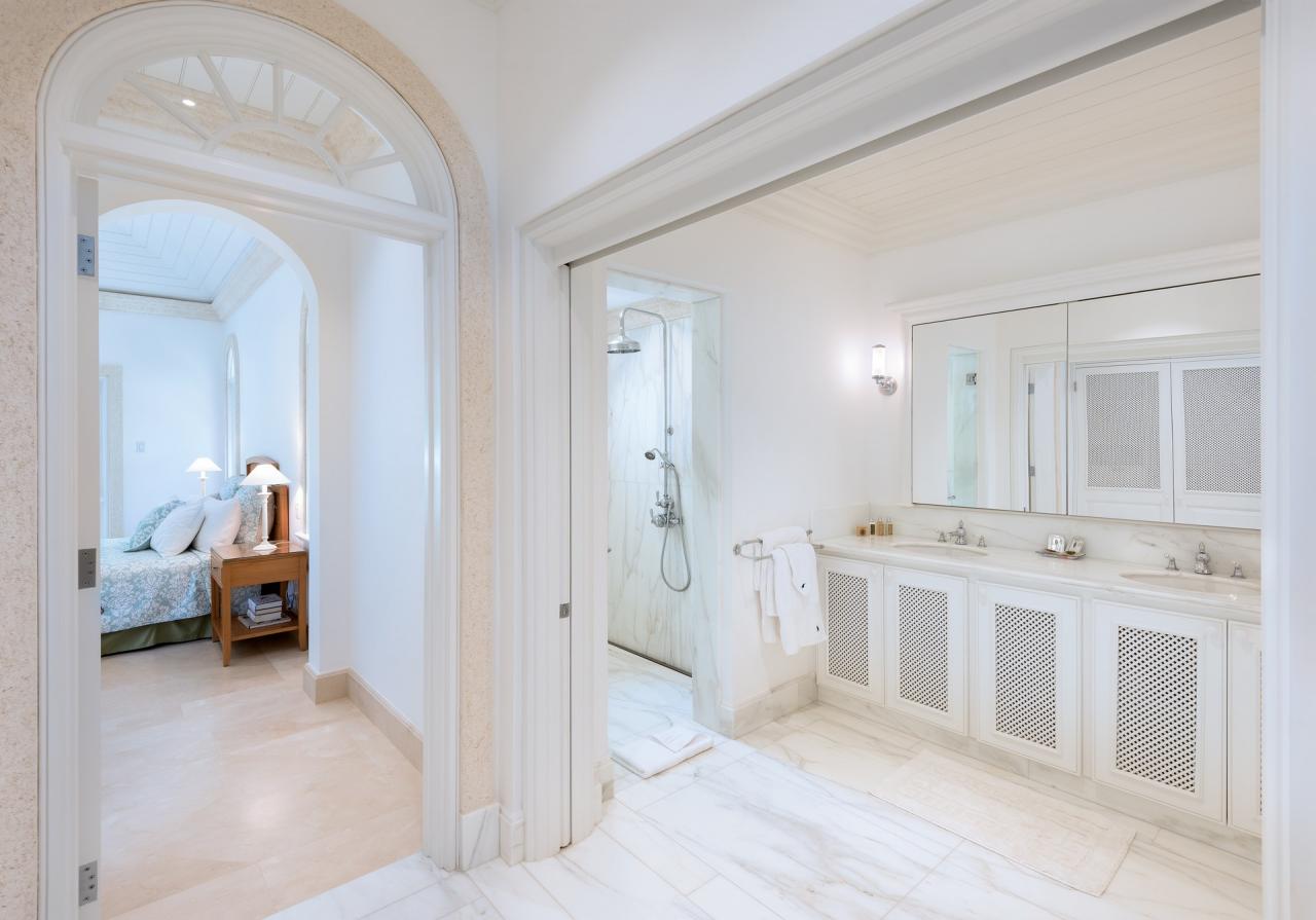 Three bedrooms are located on the first floor while the master suite is hosted on the entire upper level with views of the sea. This bedroom features a walk-in dressing room and study. The master opens to a private wrap-around balcony overlooking the ocean, bay, and pool. The master bath incorporates marble flooring with wood enclosed bath and his and her vanities.