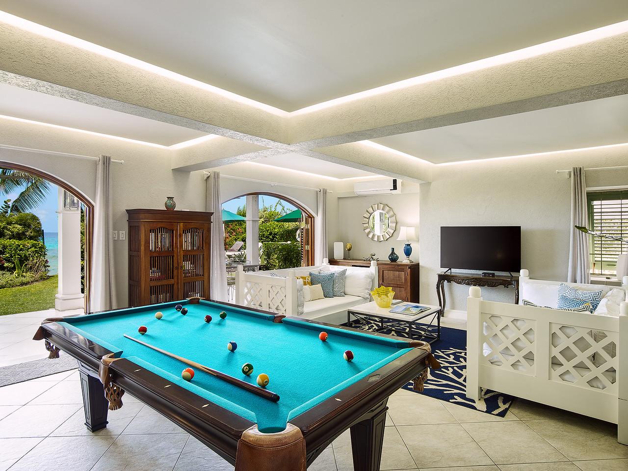 The lower level of this Barbados rental hosts a fifth bedroom with a king-sized bed, a spacious living area, and direct access to the garden and pool. The living area is ideal for relaxation, with a pool table, day beds, and easy access to the gardens and ocean views. Outdoor spaces are designed for leisure, featuring a covered patio with loungers, a splash pool, and direct beach access to the calm Caribbean Sea, perfect for water sports and snorkeling.