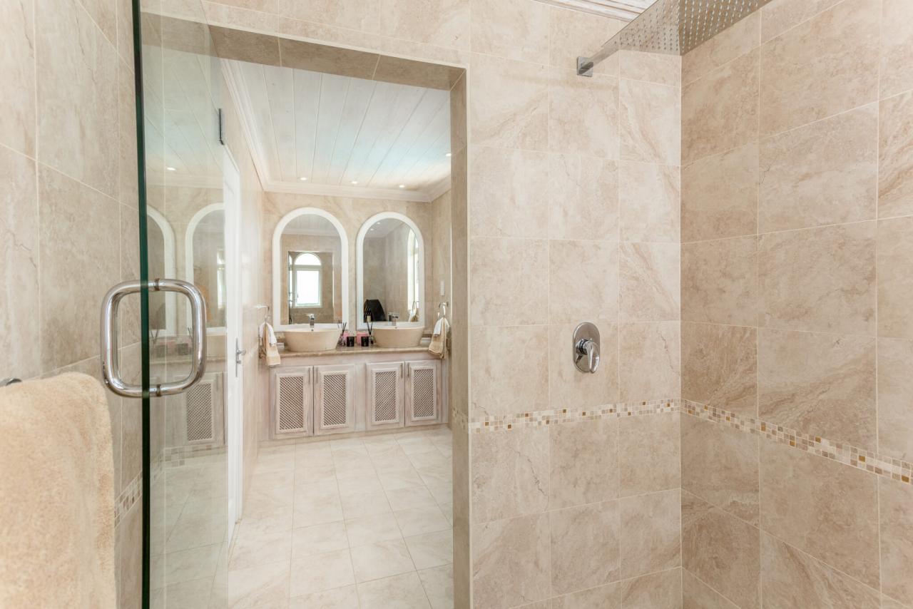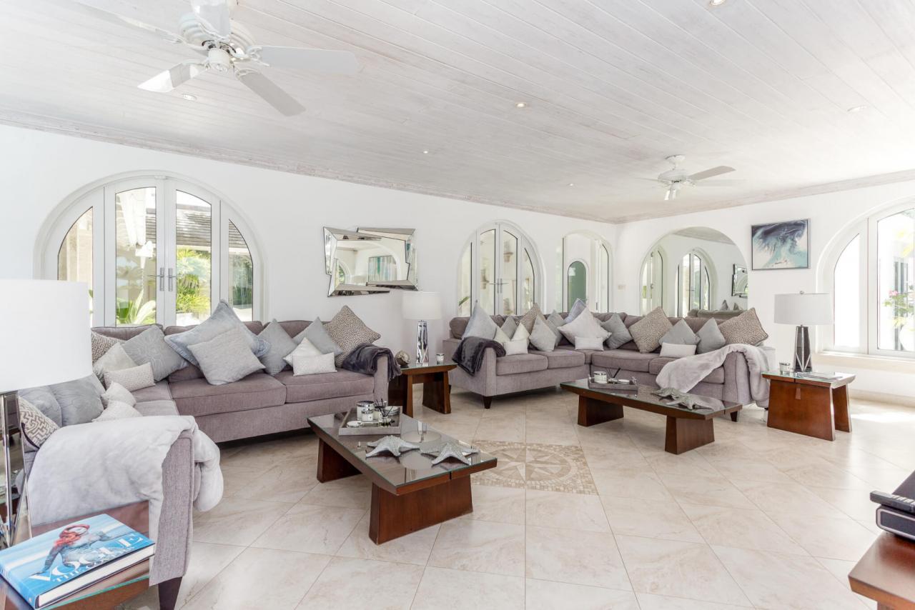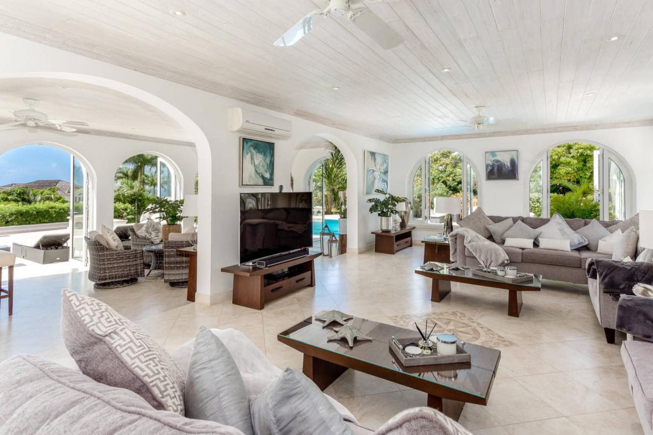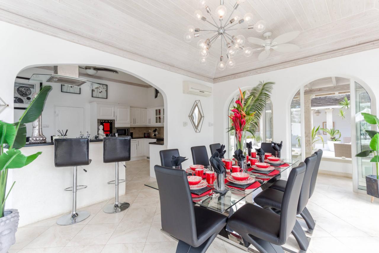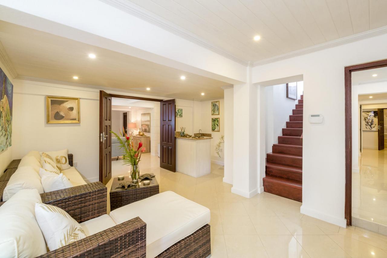 Once entering Mango Walk through the grand French floor-to-ceiling glass doors, guests are welcomed into a breathtaking courtyard that shows the villa's indoor/outdoor living design. There are traditional architectural elements that blend with the modern clear glass windows and high-quality contemporary furnishings. A newly upgraded kitchen with bar stools also serves the elegant dining room. The dining room then opens to the spacious pool deck and BBQ area, which surround one of the largest infinity pools in Royal Westmoreland. The pool deck with sun loungers and umbrellas flows directly into the large living area.