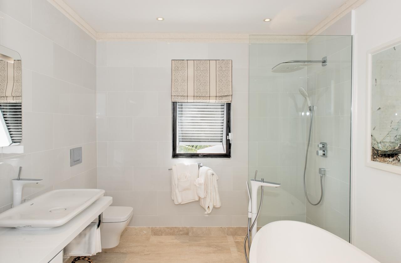 Bedroom 1: This room is equipped with a king-sized bed, AC, a ceiling fan, a TV, a walk-in wardrobe, a safe, a sea view, and an ensuite bathroom with a walk-in shower and a freestanding bathtub.