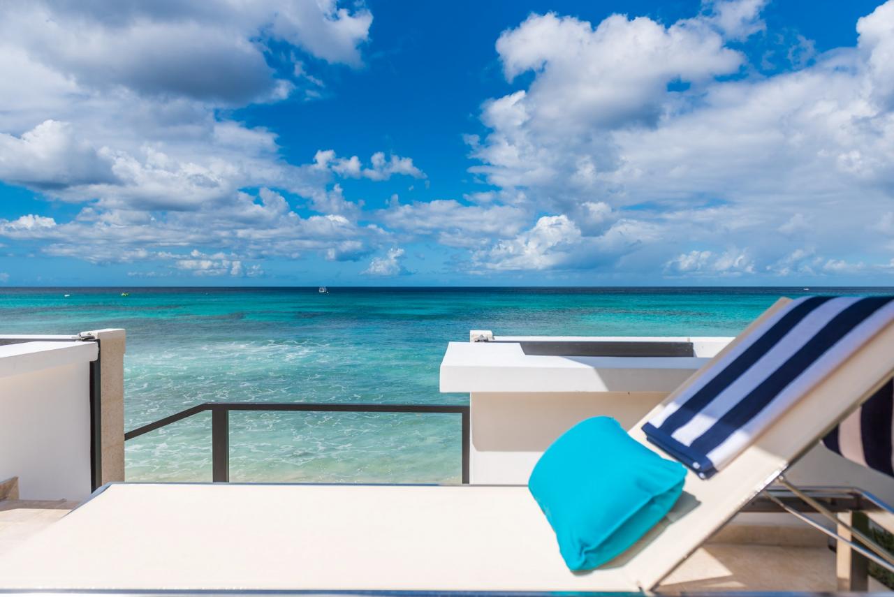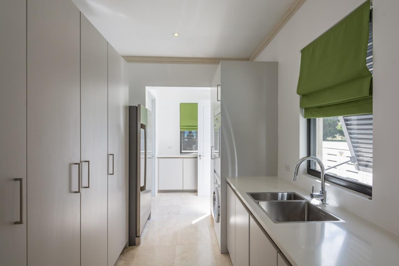 This dazzling super luxury beachfront villa offers the same high quality contemporary interiors as Mirador but includes a fifth bedroom. Nirvana’s top floor has been transformed into a unique sunset bar with plenty of seating, offering elevated sea and beach views and once the sun has set the uplifting music and glow of the subtle lighting takes over while guests enjoy expertly prepared cocktails and canapés under a star filled night. The ground floor living areas are spacious with a large family room with comfortable sofas and a 65 inch flat screen TV. The best in chef prepared cuisine can be enjoyed in a formal setting within the luxurious and air conditioned interiors or around the perfectly square alfresco dining table which can seat up to 12 hungry guests. Foodies can marvel at the delicacies being created in the well equipped entertaining kitchen with bar stools for easy breakfasts. Both dining and family rooms open onto the wide covered terrace and then onto the outstanding outdoor areas with informal dining, sun-loungers, enticing swimming pool and direct access to the beach.