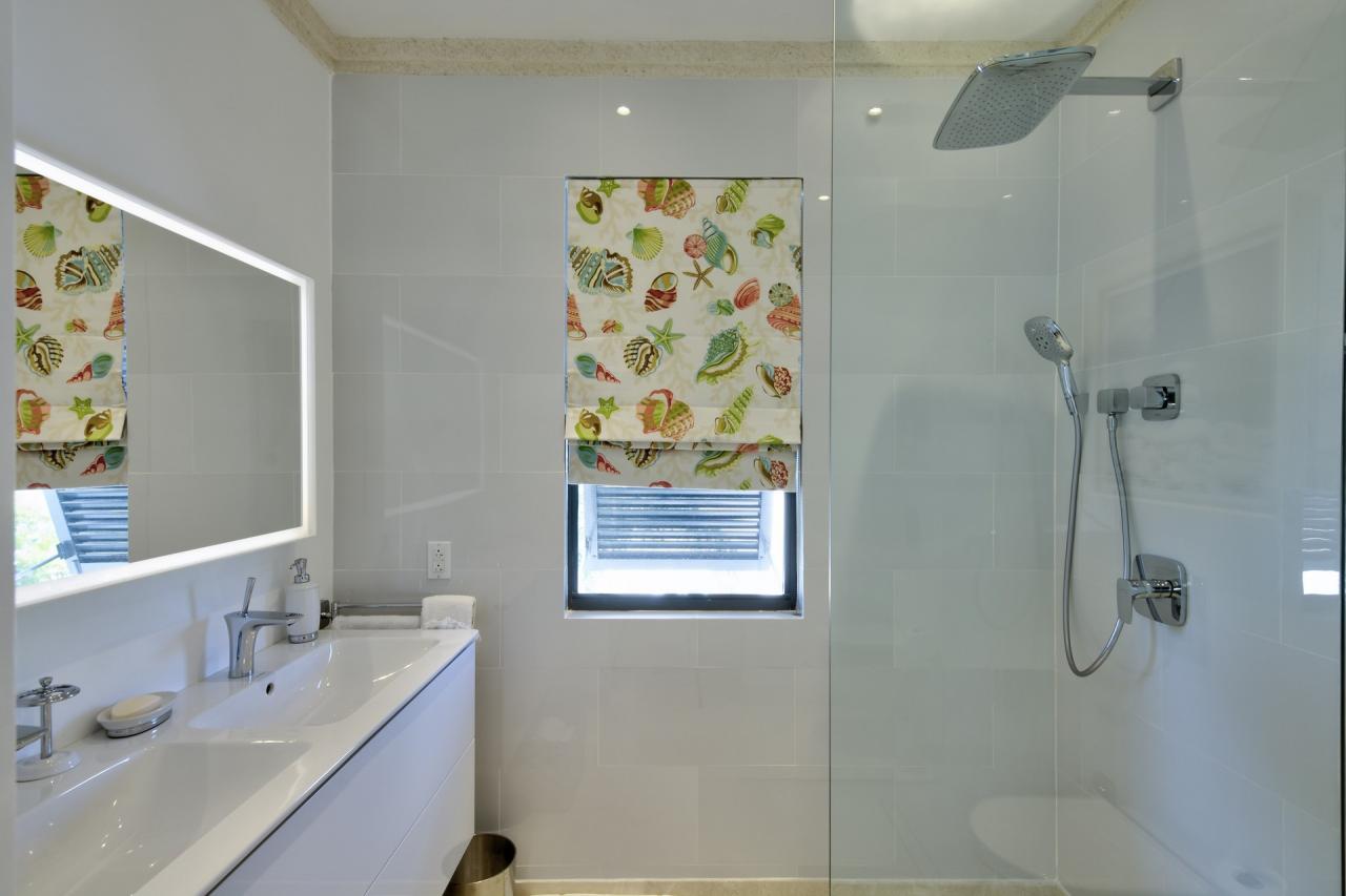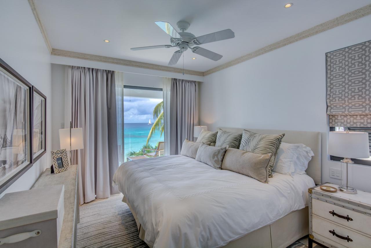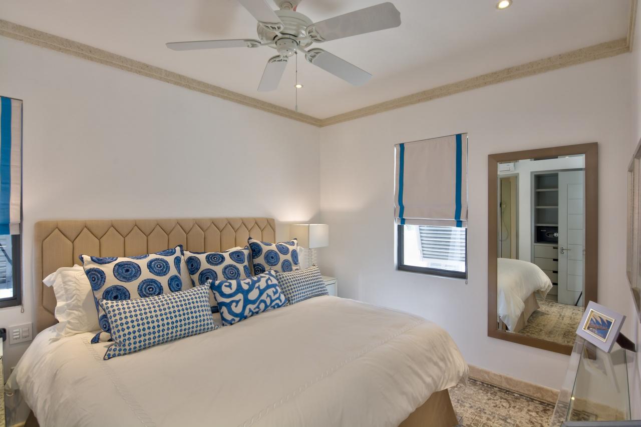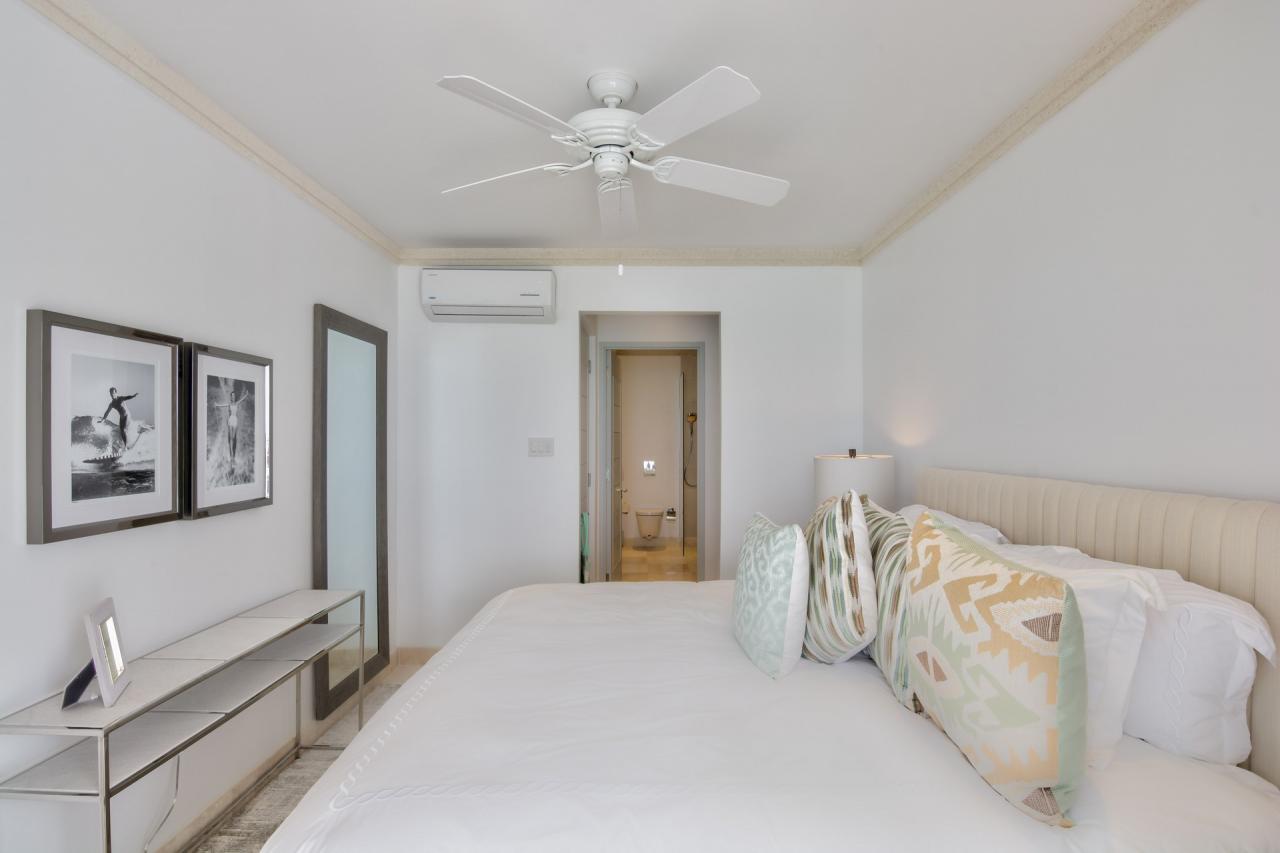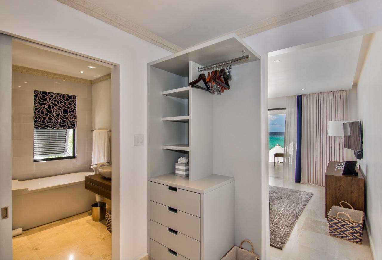 Primary Bedroom: This room is equipped with a king-sized bed, a sea view, AC, a TV, a safe, and an ensuite bathroom with a walk-in shower and a freestanding bathtub.