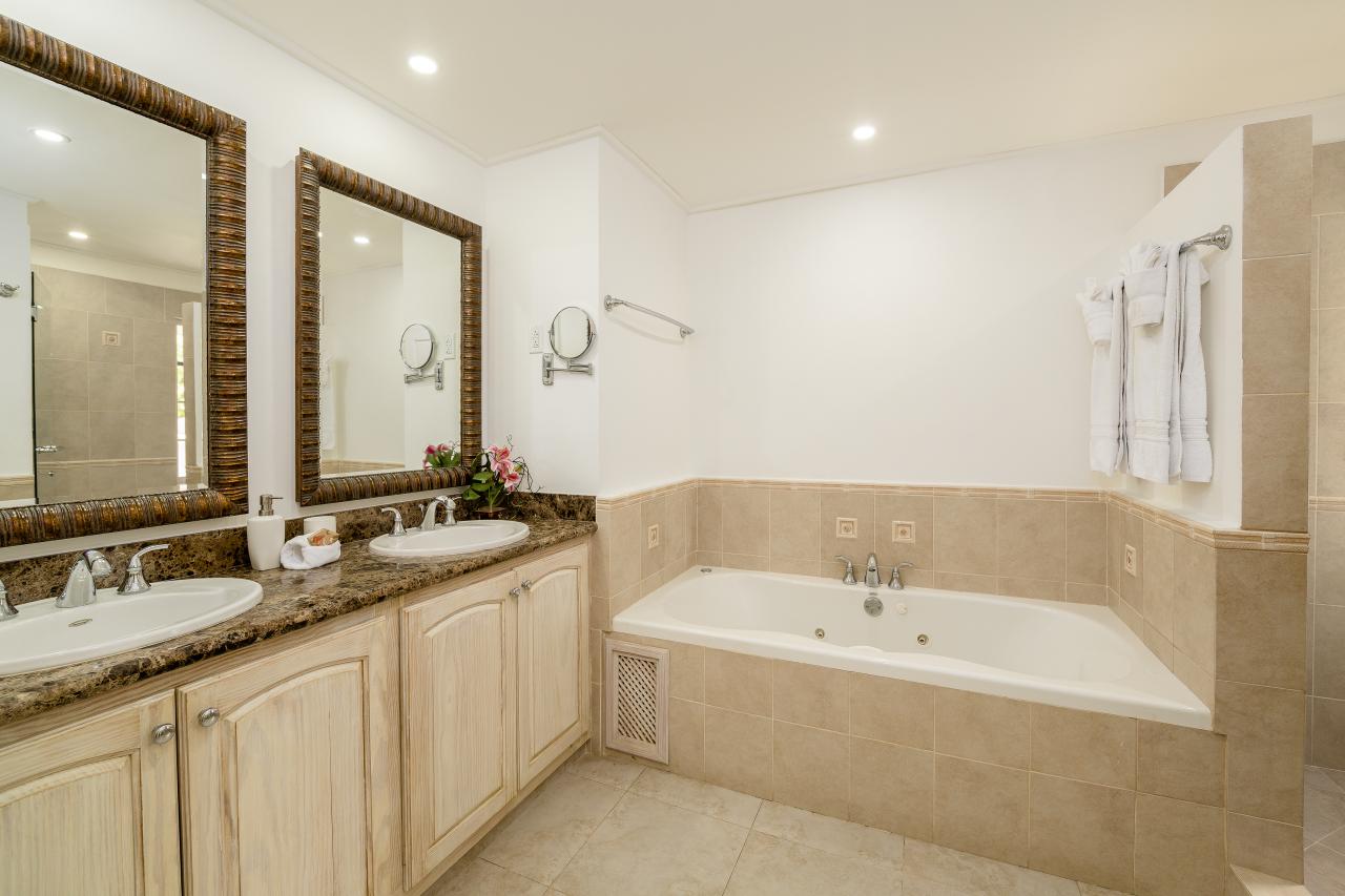Rose of Sharon is an elegant 6 bedroom villa located in Sandy Lane Estate in pristine condition . There are 4 double air-conditioned bedrooms in the main house on the first floor, with two Master bedrooms each having its own ensuite bathroom and the other 2 bedrooms also with ensuite bathrooms. The additional 2 bedrooms are located in a recently built guest cottage across from the pool, with their own living and dining areas and fully equipped kitchen.