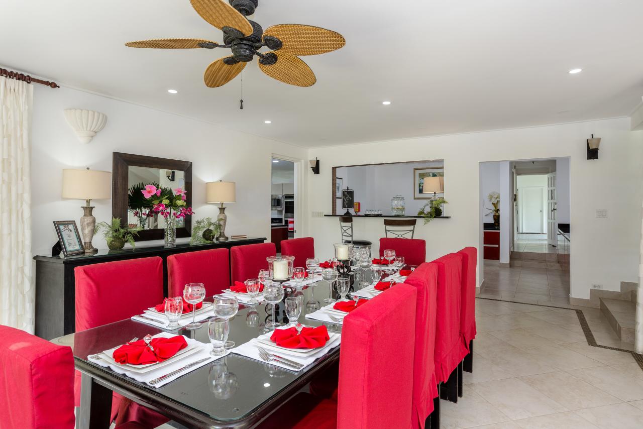 Each bedroom has an ensuite bathroom and is air-conditioned. Living can either be indoors or on the covered terrace overlooking the lovely large pool and tropical gardens stretching to 1 1/2 acres . The ground floor of the main house includes a large air conditioned living room opening onto the covered terrace and a separate dining room and further breakfast/kitchen area.