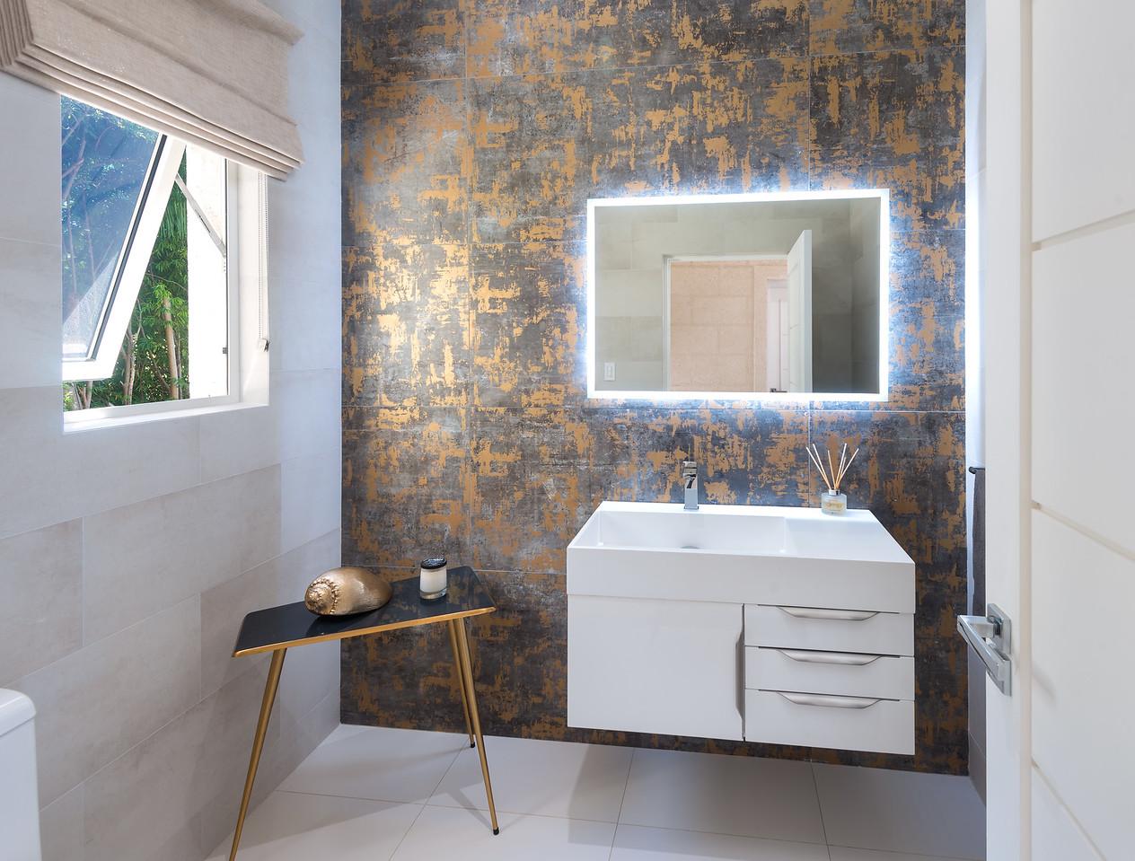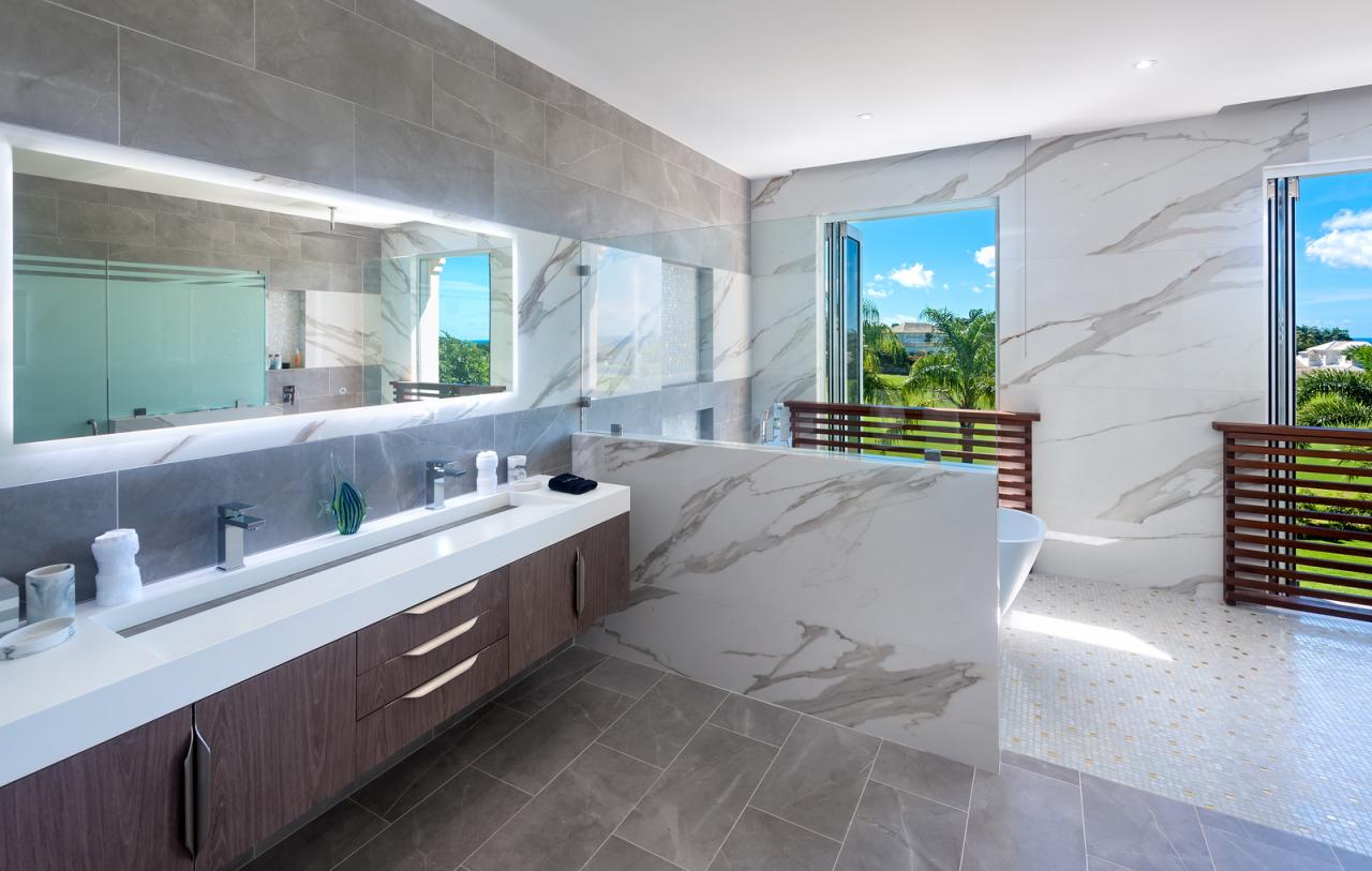 The villa's interior includes a fully equipped kitchen with European cabinetry and a stone island, leading to a generous pantry. An air-conditioned media room provides a comfortable space for enjoying movies or games. A fifth bedroom on the lower level, surrounded by lush greenery, offers a private retreat with easy access to outdoor areas. On the first floor, accessible via an illuminated wooden staircase, are four en-suite guest bedrooms, including a luxurious master suite with west-facing views of the Caribbean Sea. The primary bathroom in this Barbados rental offers a spa-like experience with porcelain tiles, high-end vanity units, and an oversized rain shower framed by bi-fold windows overlooking the sea.